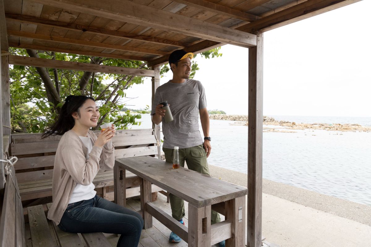 塩作り小屋の脇にある海に面した小さな東屋が最終目的地。心地よい海風を浴びながら涼んでいると、小山さんがリュックから何やら取り出しました。「能登島の梅で作ったシロップを、湧水で割ったドリンクです。どうぞ」。繊細な模様のガラスに入れられた梅ドリンクは、サイクリングで乾いた喉を潤してくれました。程よい酸味と甘さに疲れも癒やされ、さわやかな気分に。小山さんが知る能登島の素敵なところを余すところなく案内してもらえたことで、この島が身近に感じられました。