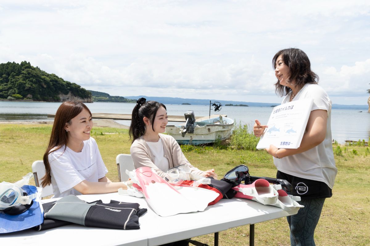 そわじ浦という静かな浜辺で「ドルフィンスマイル」を営むあんりさん。七尾で育ったあんりさんは小さいころからイルカに関わる仕事をしたいという夢があり、御蔵島・三宅島でガイドとしての経験を積み、七尾のイルカのために故郷へ戻ってきたそうです。「七尾湾はほかの生息地に比べてアクセスが便利なのも体験しやすいポイントです」とあんりさん。事前のブリーフィングはもちろんのこと、目の前のビーチでスノーケリングの方法をトレーニングしてくれたり、浮力を保ったウェットスーツを提案してくれたりと、泳ぐ人のレベルに合わせた適切なアドバイスをしてくれます。スノーケリング初心者も安心してチャレンジできますよ!