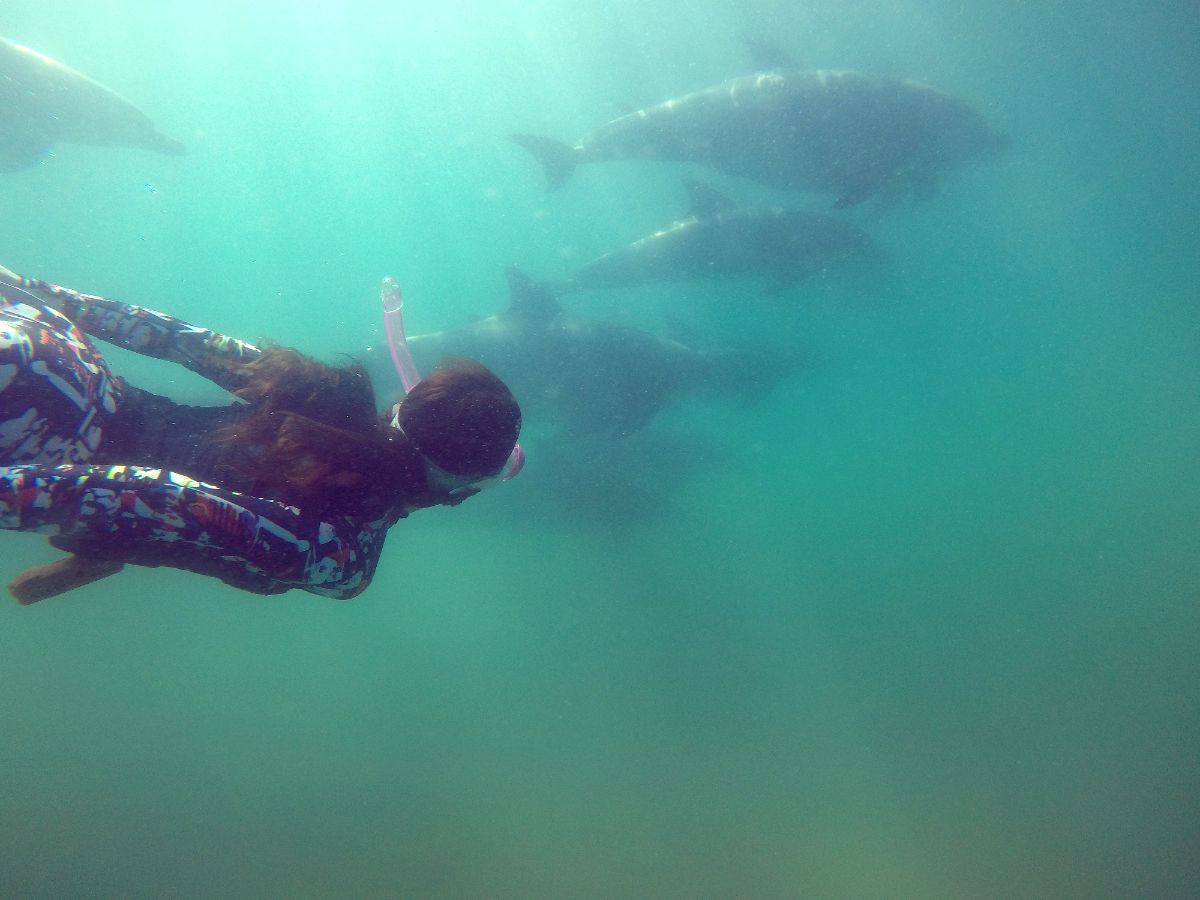 ウェットスーツに着替えたら、ウォッチングポイントへ向けて出航。まずはイルカファミリーを探します。その日によってイルカの泳いでいる場所は異なるそうですが、七尾湾ではおよそ98%の確率で見つかるとか。出会えたらスタッフの案内で海へダイブ。海の中を気持ちよく泳ぎ回るイルカファミリーと一緒に泳げるなんて、まるで自分もファミリーの一員になれたような気分です。イルカたちは超音波で対象物を認識していて、目はほとんど見えないはずなのに、近くで泳いでいると目が合うような瞬間があってドキドキ! イルカのかわいさにノックダウンされてしまいました。