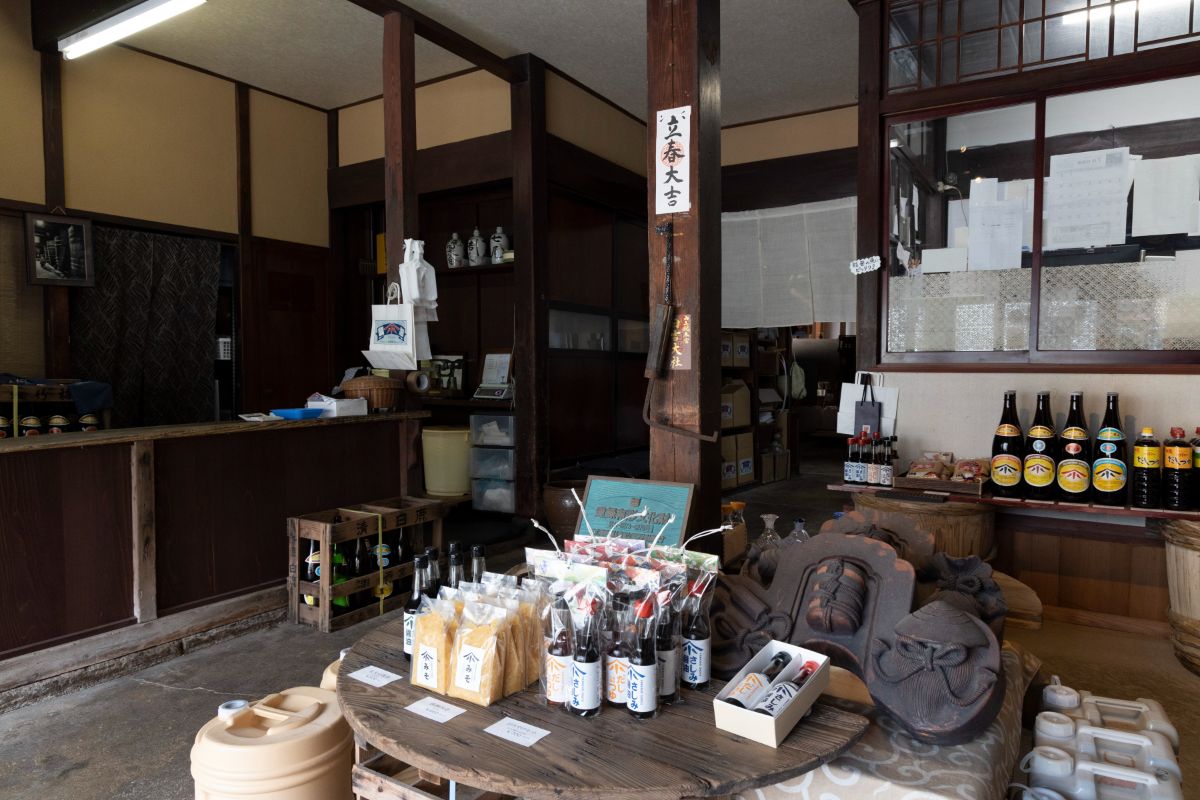 醤油4種とだしつゆ、味噌などを家族で製造・販売しています。看板商品は「本醸造醤油」1ℓ580円。料理の味を豊かにするキリッとした塩味がありながら、大豆のふくよかな香りと旨味が広がります。もちろん商品の購入だけで訪れても大丈夫ですが、今回は女将さんの蔵案内とともに楽しめる醤油麹作りを体験します。奥に入るほど、醤油の香りが濃厚になる蔵の中で醤油の醸造方法を聞いたり、建物の歴史を教わったりしてから醤油麹作り体験へ。作業は簡単で、板麹を瓶に割り入れ、「本醸造」「天醤油」「旭醤油」の中から好みの醤油を注ぎ入れるだけです。自分の好きな味に仕上げられるなんて、うれしいですね。