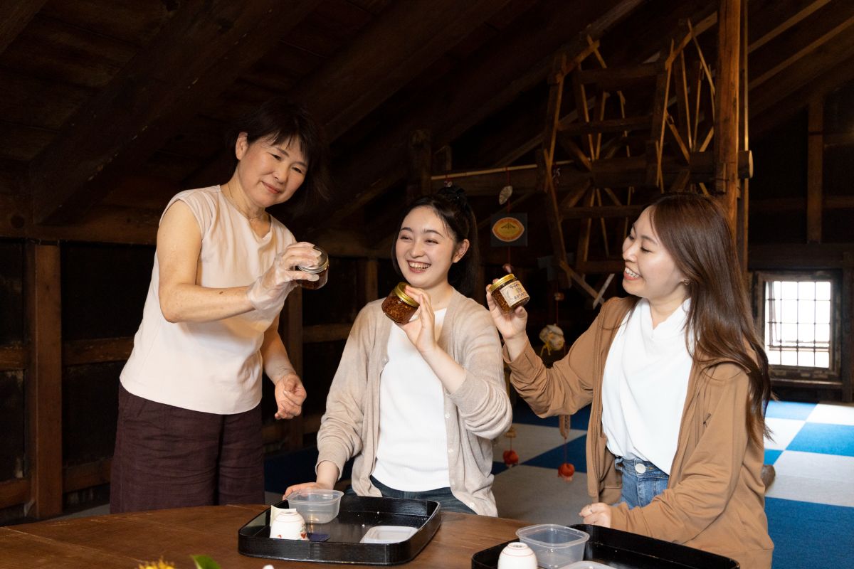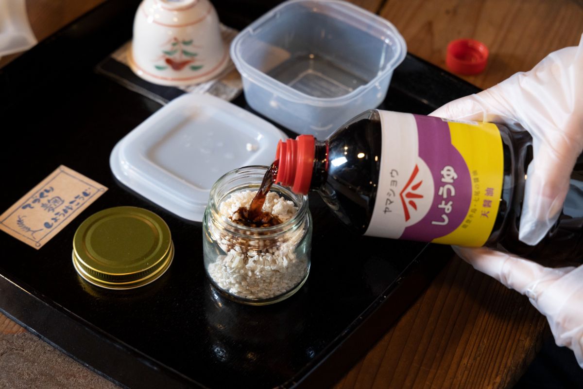 「あとは麹菌がおいしくしてくれるのを待つだけ。1日に1回くらい『おいしくな~れ』と言いながらふりふりしてね」と話す女将さん。夏は1週間~10日、冬は2週間くらいでできあがるそうです。できあがった醤油麹は野菜に付けてディップしたり、肉を漬け込んで焼いたりして味わえます。家に持ち帰って瓶をふりふりするたびに、女将さんとの楽しい醤油麹づくりが目に浮かびそうですね♪
