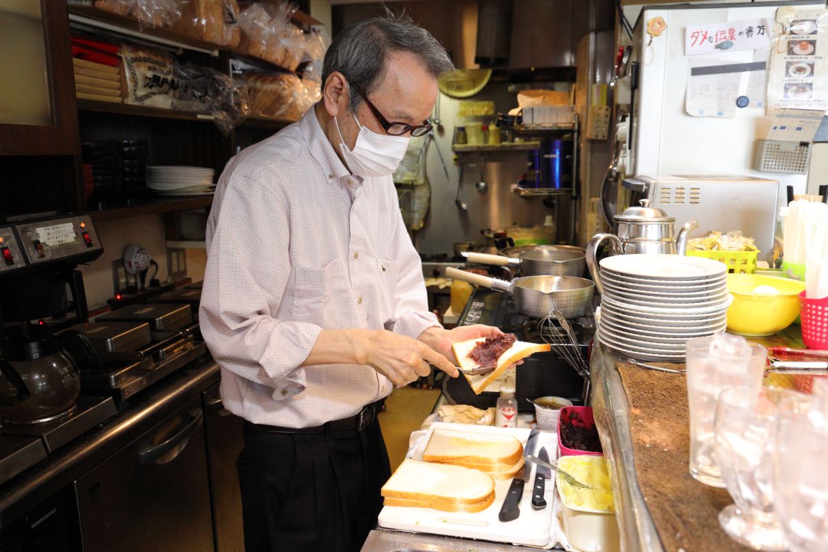 マスターの川合和行さんは、厨房に立ち次々にプレスサンドを焼き上げていきます。「モーニングサービスの時間が過ぎるとどうしてもお客が遠のいちゃってね。苦肉の策として『終日モーニング』をはじめたら評判になってしまって」とユニークなサービスをはじめたきっかけを話してくれました。