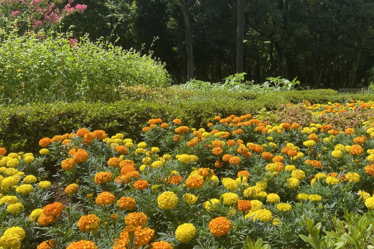 「中央広場」のなかには花壇が点在する「フラワーランド」も。訪れた日は真夏でしたが、ボランティアの方が整えているという花壇には色とりどりの花が咲いていました。心癒やされるひとときを過すことができます。また「フラワーランド」の隣にはドッグランもあり、ワンちゃん連れで遊ぶこともできます。