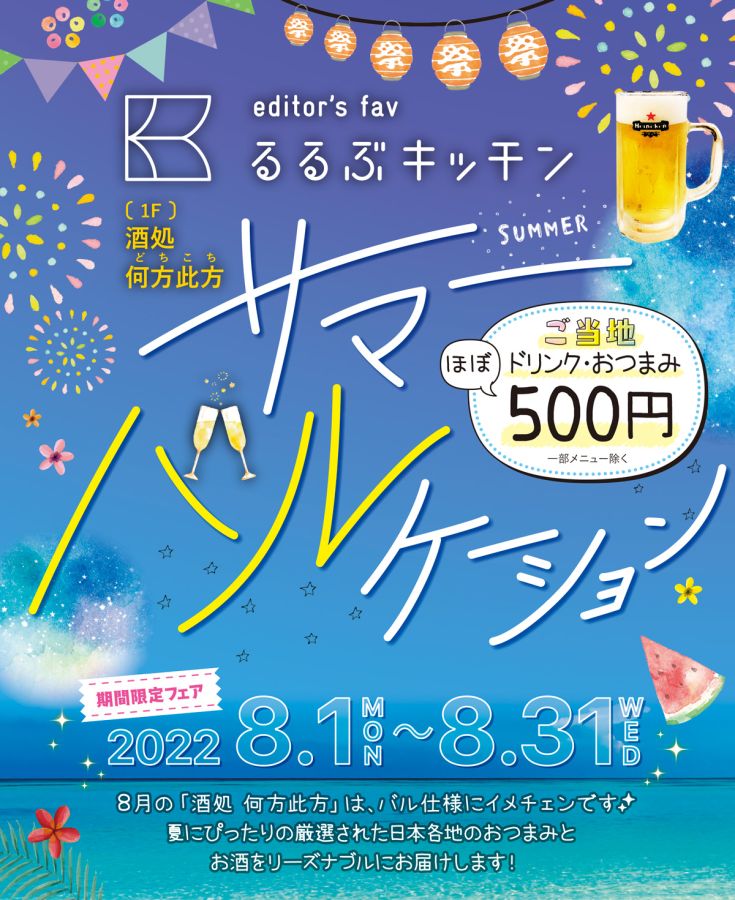 JR新宿駅 東南口から徒歩2分のるるぶキッチン「酒処 何方此方(さけどころ どちこち)」では、「るるぶキッチン×サマーバルケーション」フェアを2022年8月31日(水)まで開催中!立ち飲みスタンドで夏を楽しめるご当地産品を全国から取り寄せ、500円のワンコインで食べられるバルメニューとして提供しちゃいますよ!(※一部500円でない商品もあります)