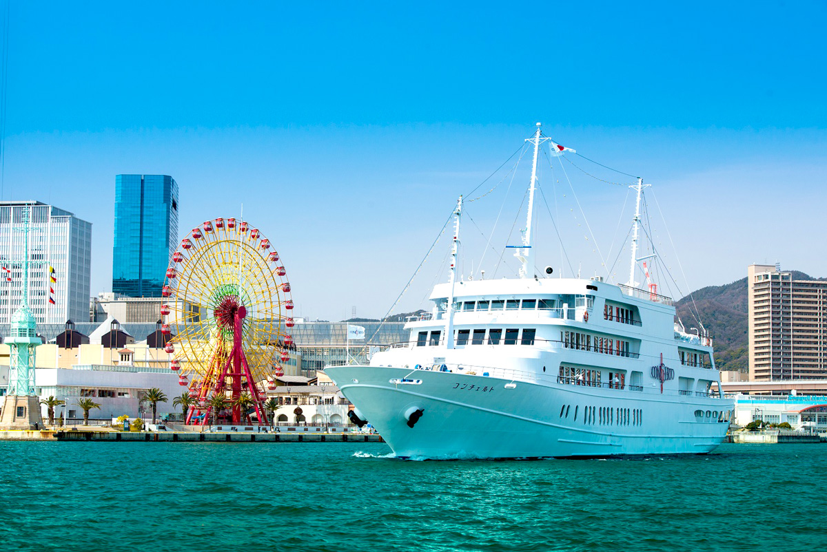 ハーバーウォークから高浜岸壁を経て、クルーズ船乗り場へ。約600名が乗れる大型客船「コンチェルト」でランチクルーズを楽しみましょう。航路は神戸ハーバーランドを出航し、造船所や神戸大橋を眺めつつ、明石海峡大橋の手前にある須磨海浜水族園付近で折り返し戻ってくる約2時間のコースです。