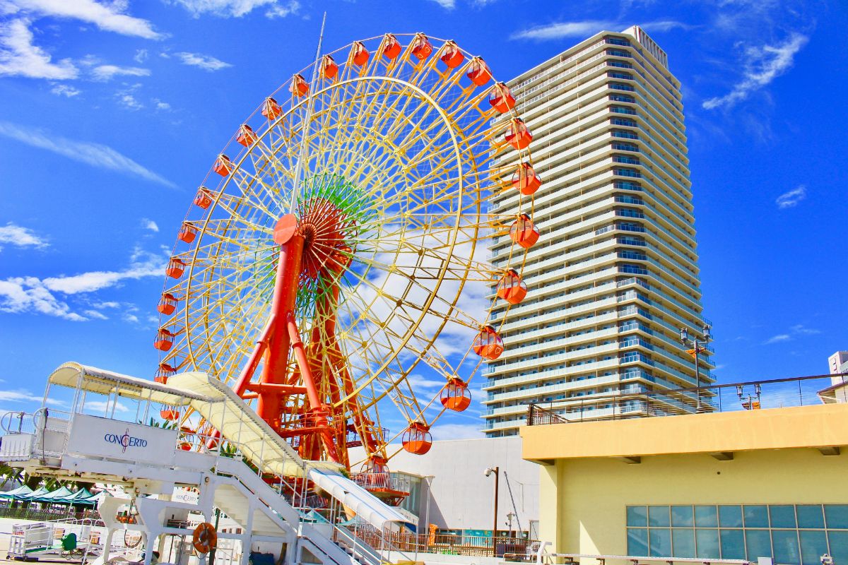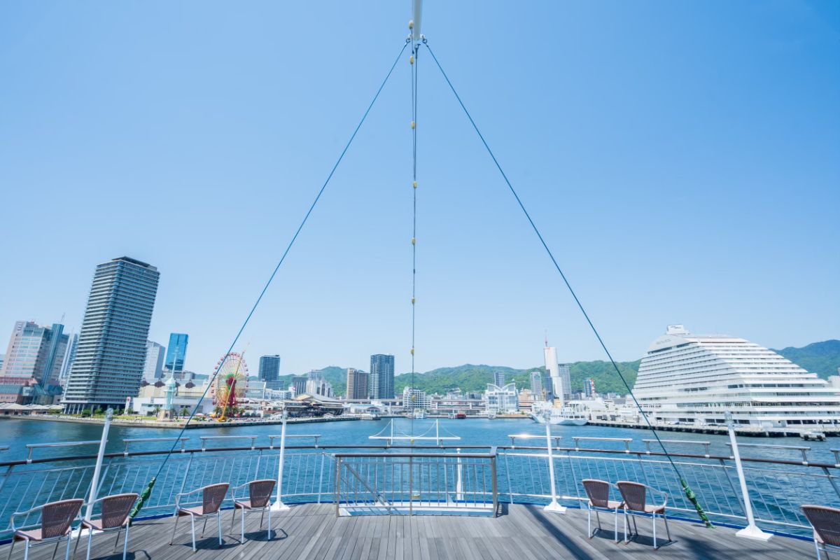 メインマストがそびえるデッキは、晴天時は出入り自由。船の上からしか見られないパノラマ絶景が広がり、潮風も気持ちいい!出航時、船尾に立つと、右手に曲線美が印象的な白いホテル、左手に観覧車が見渡せます。