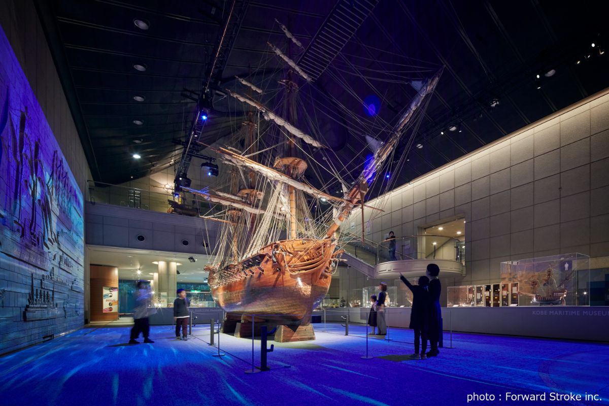 神戸港に突き出た中突堤付近一帯に広がる「メリケンパーク」は、神戸の定番デートスポット。公園内でひと際目を引く、帆船の帆と波をイメージさせる大屋根の建物が「神戸海洋博物館」です。実物、模型、映像、グラフィック、体験型の展示を交えて、海や船、港の歴史と未来をわかりやすく紹介しています。