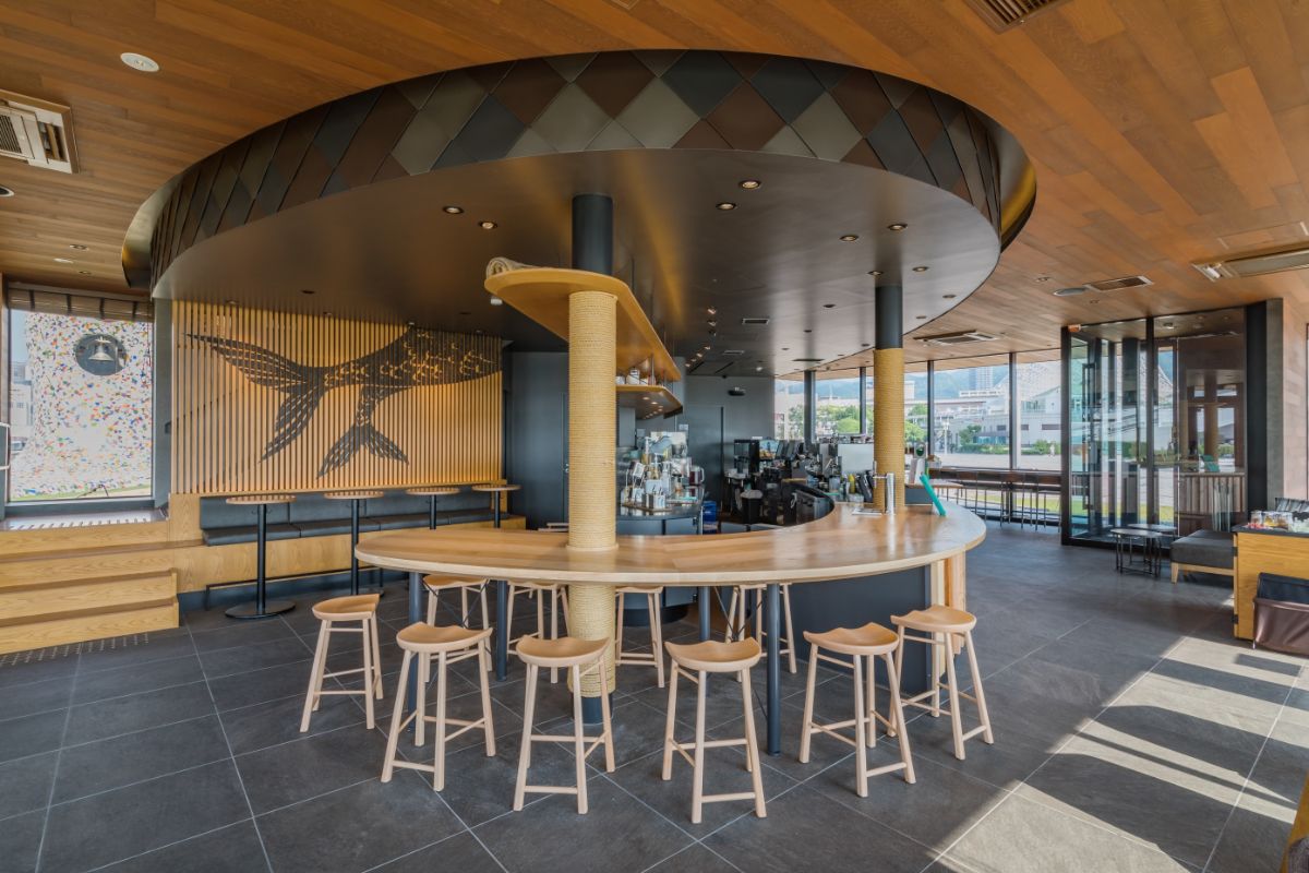 ガラス張りで開放感のある店内にはソファやベンチシートなど約70席があります。眺望が楽しめるように、テラス席も約30席と豊富に用意。船首をイメージした2階席の窓辺カウンターやテラス席で、のんびりとコーヒーを楽しんで。