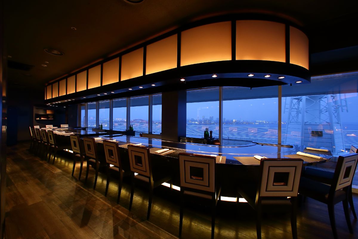 三方を海に囲まれたホテルだから、眺望は抜群。14階「ステーキハウスオリエンタル」の大きな窓からは西側と南側の夜景がきれいに見えます。