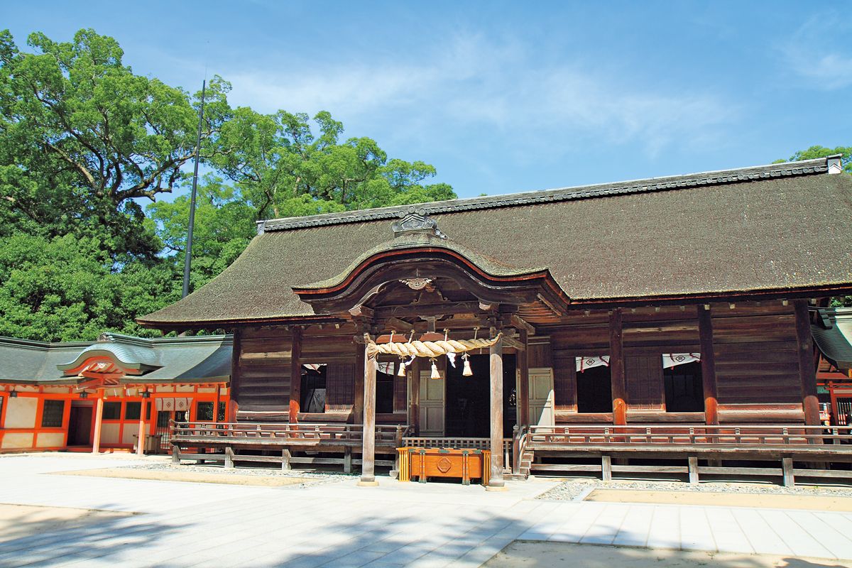 本殿正面では「小千命(おちのみこと)御手植の楠」とよばれる樹齢2600年あまりの御神木が、圧倒的な存在感を放っています。幹の周囲は約11mという巨木で、息を止めたまま3周すると願いが叶うと言われているんですよ。