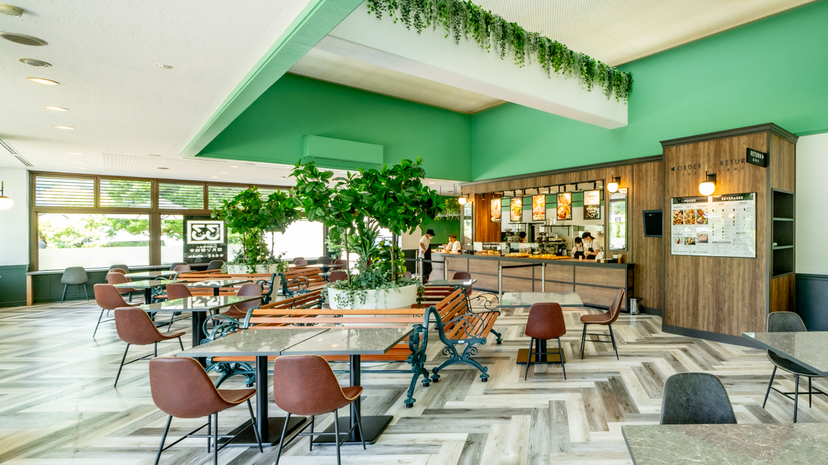 森林公園との共存をテーマにしている店内は、ホワイトやグリーンが印象的。空間をぜいたくに使用した全84席がゆったりと配置されていて、空調の効いた心地よい環境ながら、屋外と地続きのような気分でくつろぐことができます。