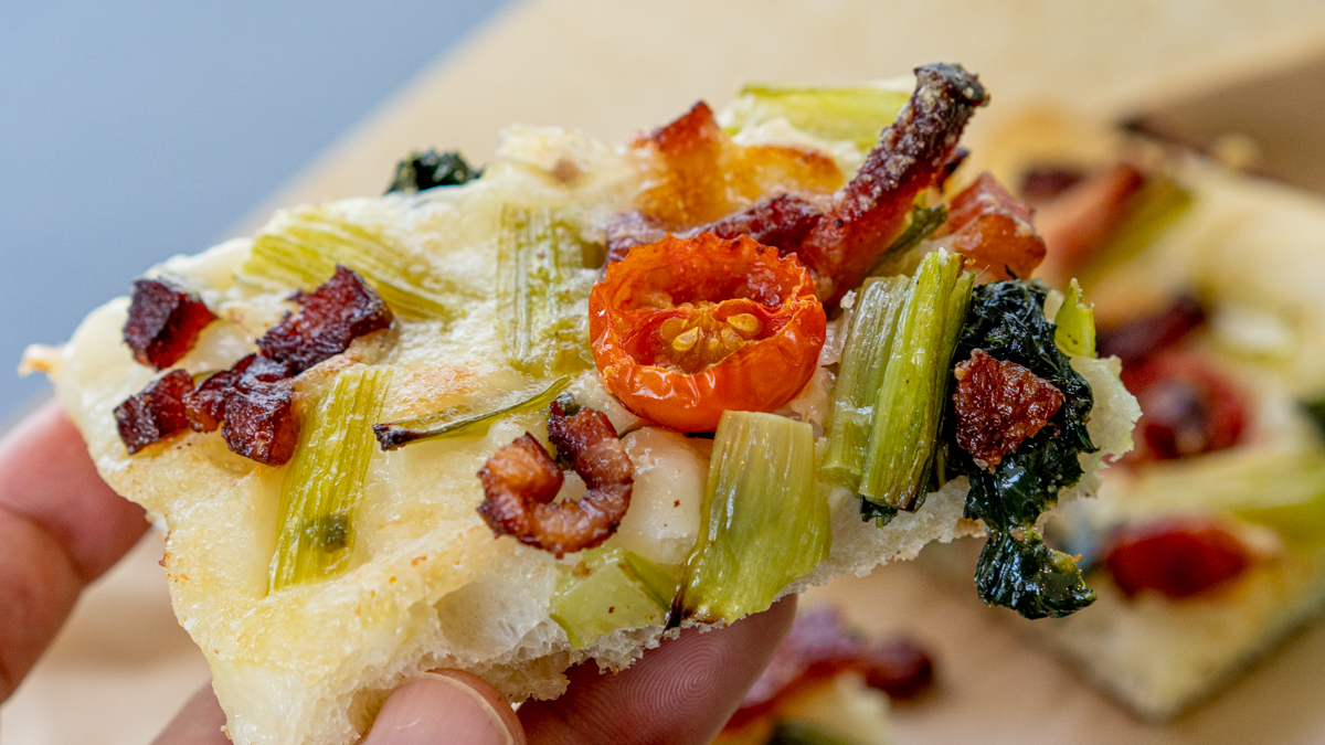イタリア語で「スライスされたピザ」を意味するだけあり、提供の際には20×10cmの食べやすい長方形サイズにカットされるこちらのメニュー。耳にあたる面積が少なく、具材が敷き詰められているのもうれしい特徴です。
