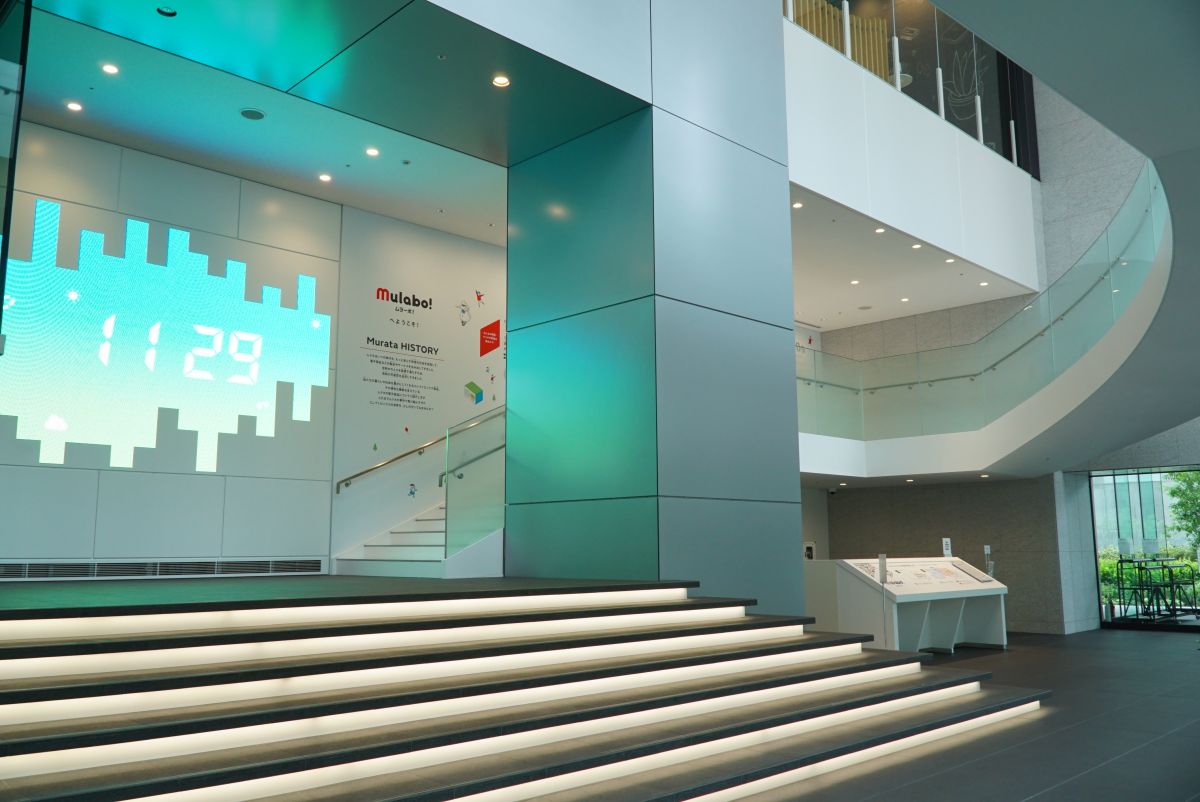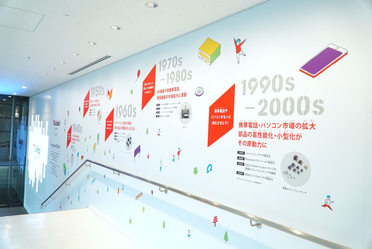 ウェルカムビジョンのそばの2階へと続く階段には、村田製作所が歩んできた電子部品作りなどの流れがずらり。昭和19年(1944)の創業以来、ラジオや携帯電話、パソコンの普及や性能の向上に貢献してきた村田製作所。そんな会社ならではの展示や体験が待っていると思うと、期待も高まり、思わず足取りも軽くなります。