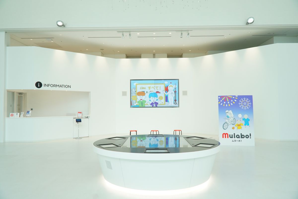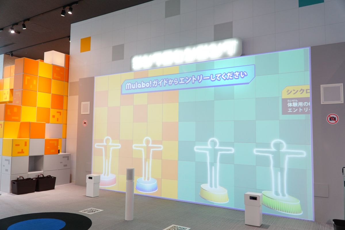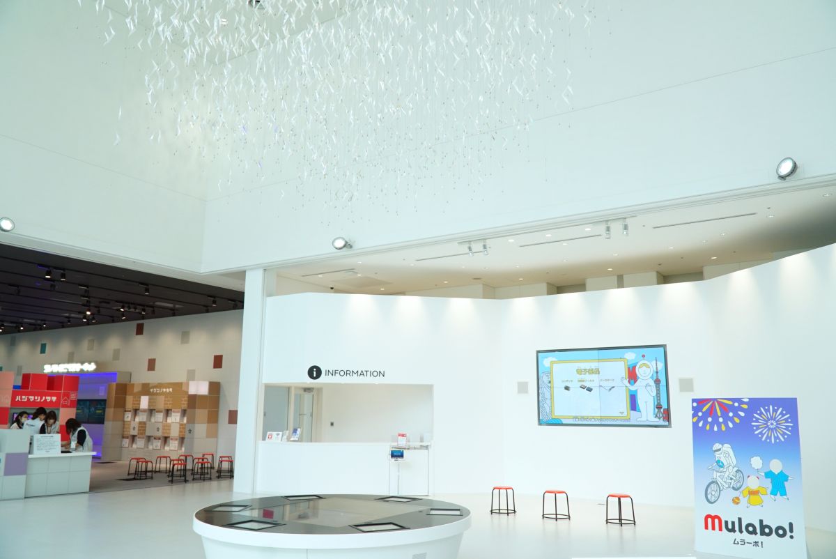 1階のヒストリーゾーンでは、ウェルカムビジョンに映し出された「Mulabo!」オリジナル映像がお出迎え。電子基板をイメージしたスタイリッシュな映像に思わずワクワクします。