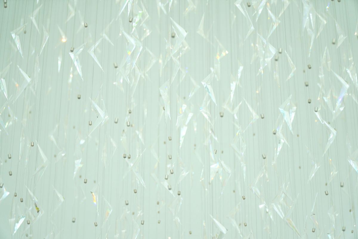 天井に配されたインテリアはエレクトロニクスのかけらをモチーフとしたシンボルアート。801本のワイヤーに吊るされてキラキラと輝いています。