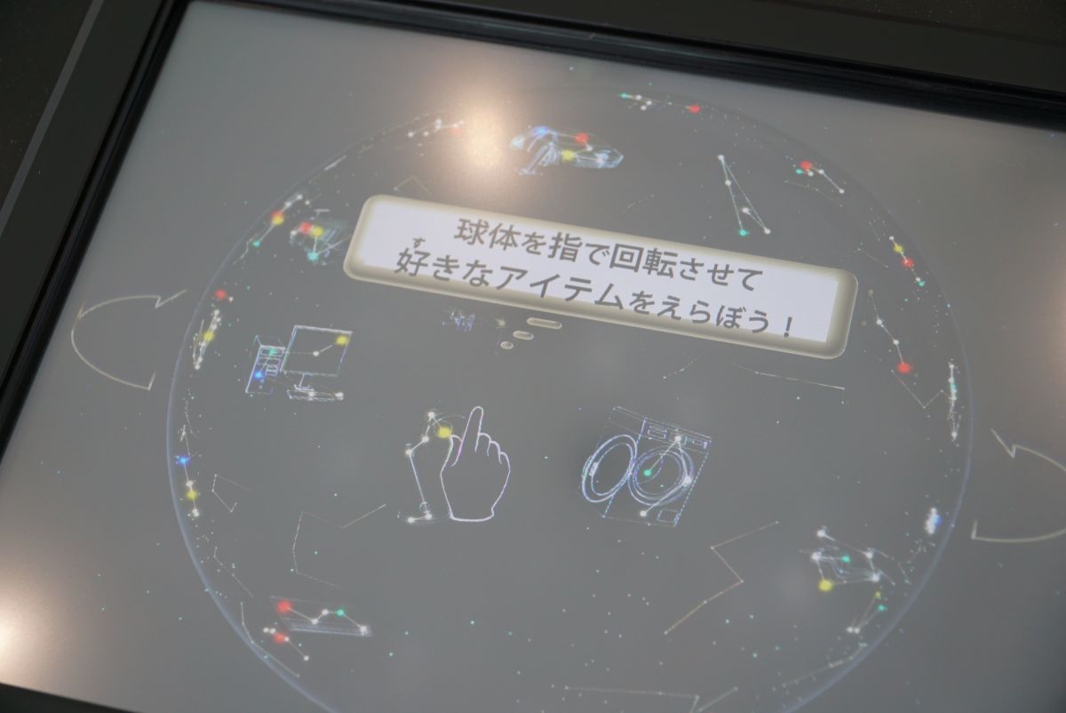 星座のように広がるドライヤーやパソコン、洗濯機といったエレクトロニクス製品を選んでタッチ操作を行うことで、電気製品が動く仕組みやエネルギーの動きなどを学ぶことができます。パネルは子どもが強くタッチしても安心なように厚めで操作性のよい特殊なパネルを使用しているのだそう。「Mulabo!」の体験展示は基本的に小学校5・6年生を対象にしていますが、年齢問わず気軽に楽しめるもポイントです。