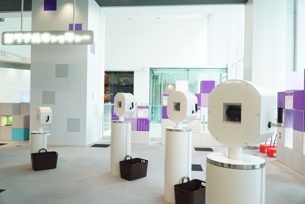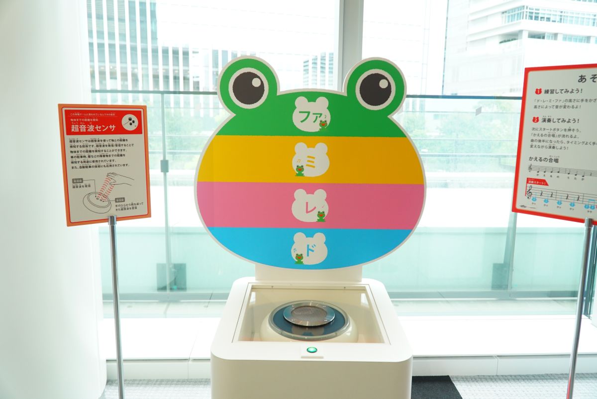 ちなみに、「ディスカバーゾーン」では端末を返却後、クイズやゲームを再度行うことはできませんが、そのほかに予約不要で楽しめる体験展示もあります。写真のカエルがキュートな展示は、村田製作所が開発した物体までの距離を検知する「超音波センサ」を駆使したもの。手をかざす場所によって異なる音が出るようになっています。リズムに合わせて『かえるの合唱』を演奏できるかチャレンジしてみましょう。