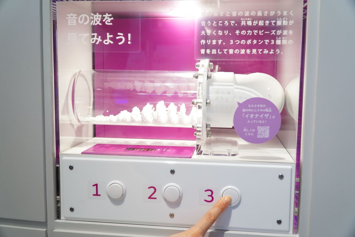 普段は目にすることができない音波を視覚化した展示も。3種の異なる音でビーズの形がそれぞれどう変わるのかがよくわかります。