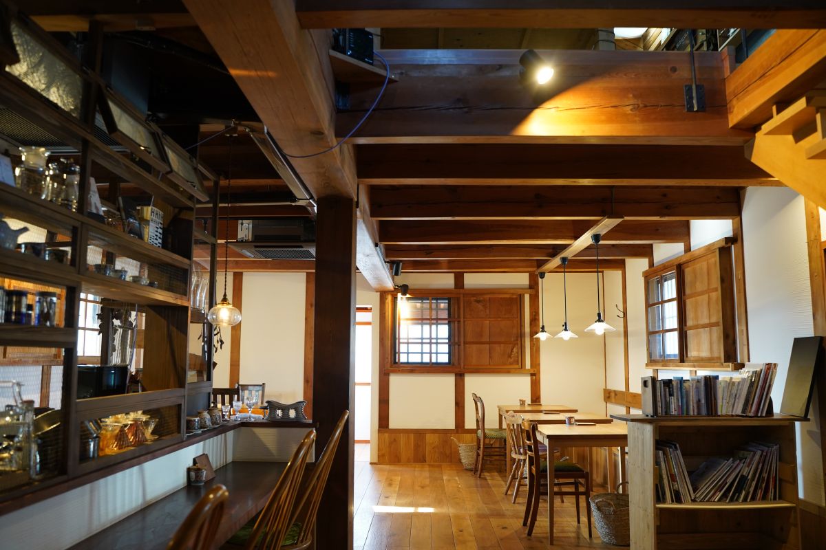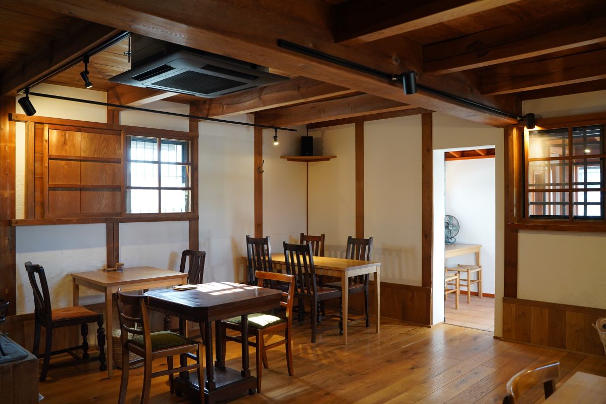 土蔵の梁を生かした木の温もりが感じられる店内は、つい長居をしてしまいたくなる雰囲気。テーブル席は2人掛けが中心で、3人掛けと4人掛けは各1席ずつ。4人以上の場合は分かれての案内となります。気心の知れた人と、少人数で訪れるのがおすすめです。