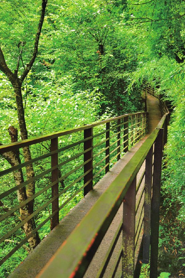 第1観瀑台から右手に見える吊橋。観瀑トンネル内の通路を使うと行くことができます。吊橋からは滝が川状に流れる様子を横から見学することができます。横からの眺めは、正面から見るよりもどこか優美。