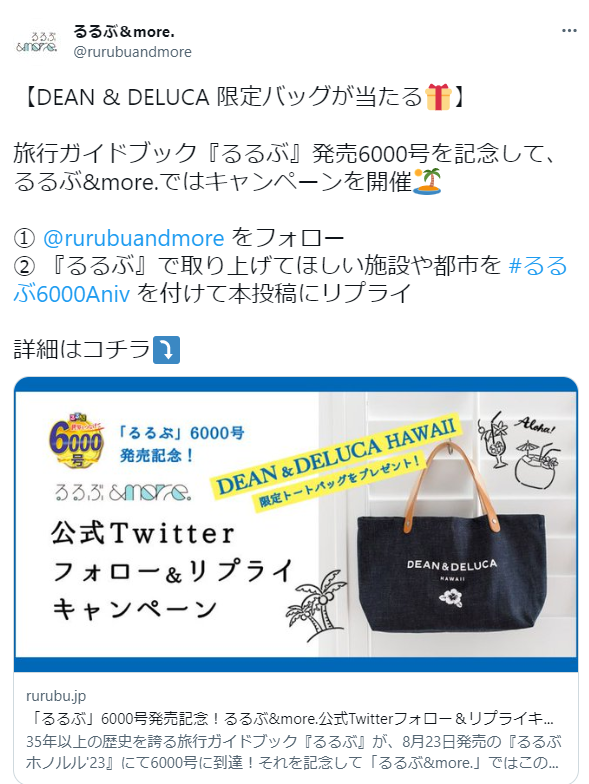 応募方法はとっても簡単の2ステップ。まずは「るるぶ&more.」の公式Twitter(@rurubuandmore)をフォロー。その後、キャンペーン対象ツイートにハッシュタグ「#るるぶ6000Aniv」を付けて、「るるぶ&more.」で紹介してほしい施設や都市をリプライするだけ。応募者の皆様より、抽選で5名様に『るるぶホノルル'23』&「DEAN & DELUCA スモールトートバッグ」(DEAN & DELUCA HAWAII 限定アイテム)をセットでプレゼントしちゃいます!