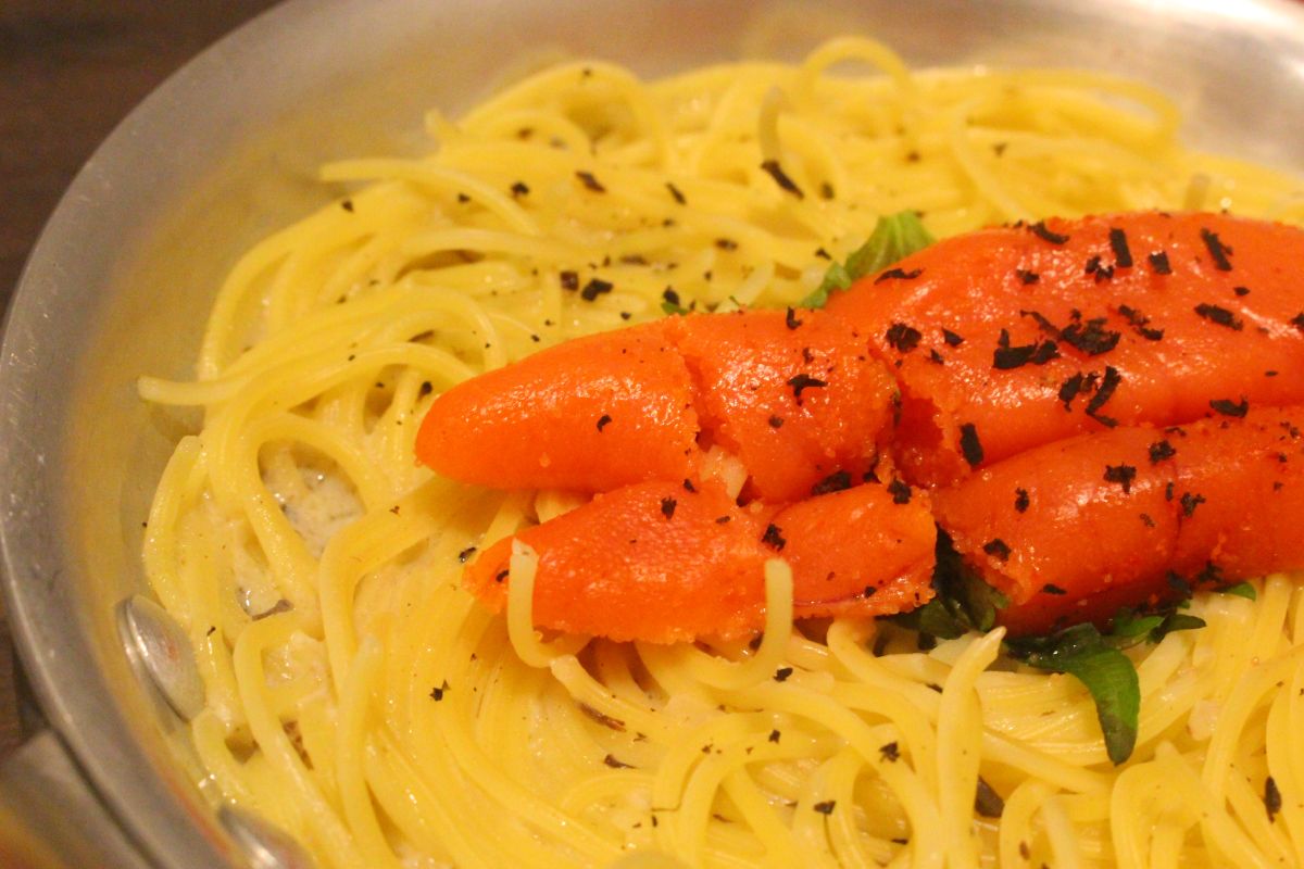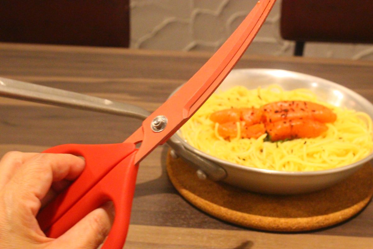 料理には、パスタを取り分けるトングと一緒にハサミも添えられています。これはトッピングの明太子をカットして食べやすくするためとのこと。この“お客がひと手間かける演出”が、写真や動画を撮影する人に大好評なのだとか。明太子を輪切りにするか、大胆に縦にカットするかは、お好みで!