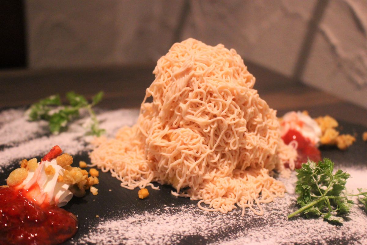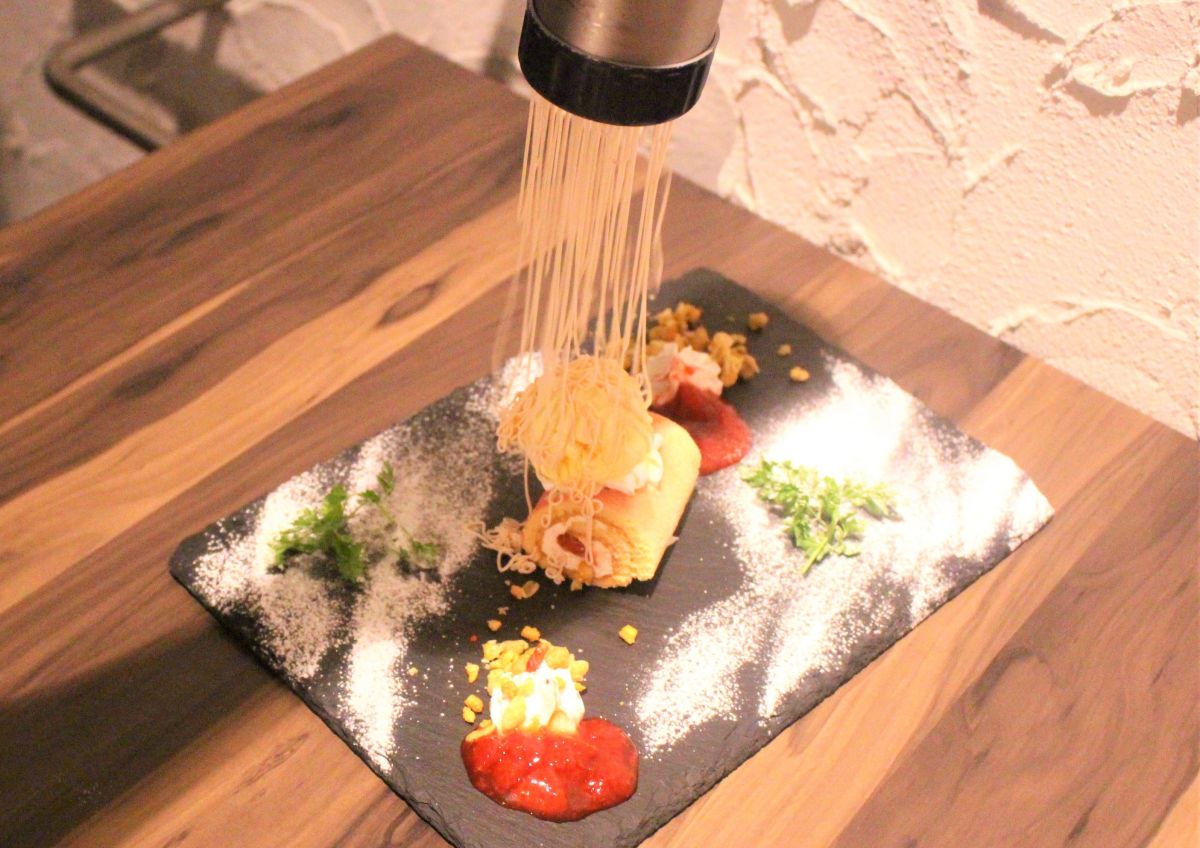 プレートに盛り付けられたデザートは、これだけでも素敵なので写真に収めたくなります。でも「モンブラン」なのに、おなじみの細~く絞り出すクリームがありませんね。するとスタッフが何やらマシンを手に登場!