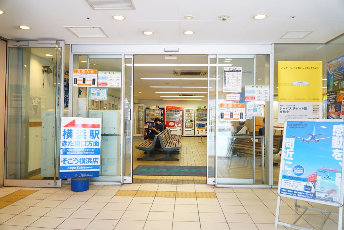 乗船チケットを購入したら、運航時間の5分前にターミナルに集合し、スタッフにチケットを見せるだけ。写真は「横浜駅東口」のターミナル。横浜ベイクォーターの2階にあります。