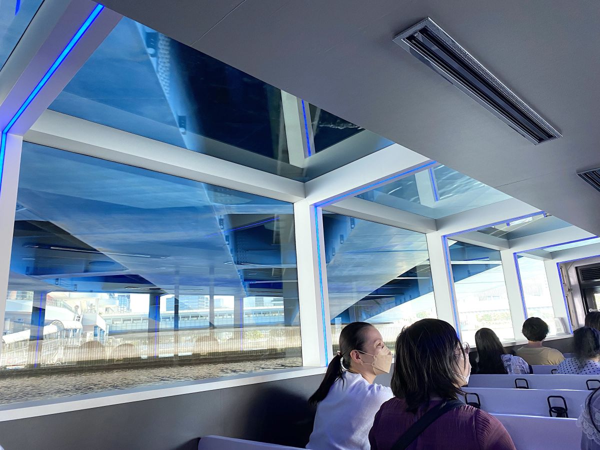 「横浜駅東口」ターミナルから出発し、横浜港に出るまでにいくつかの橋の下を通過します。客室部も後部デッキも天井の一部まで窓になっているので迫力満点!
