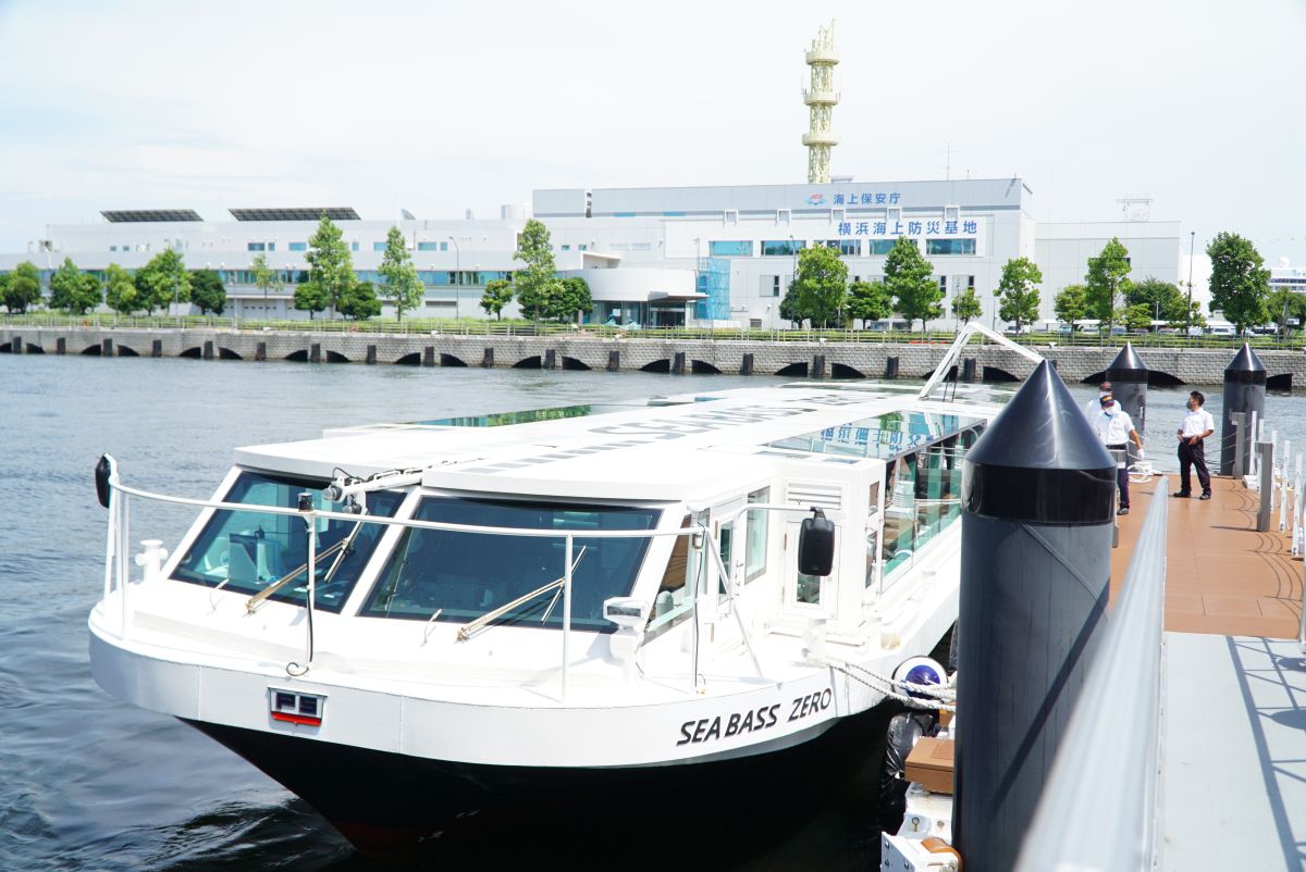 今回乗船したのは、2020年に就航した「シーバスZERO」。窓が大きく近未来を感じさせるデザインが特徴的です(写真は「ピア赤レンガ」のターミナル)。
