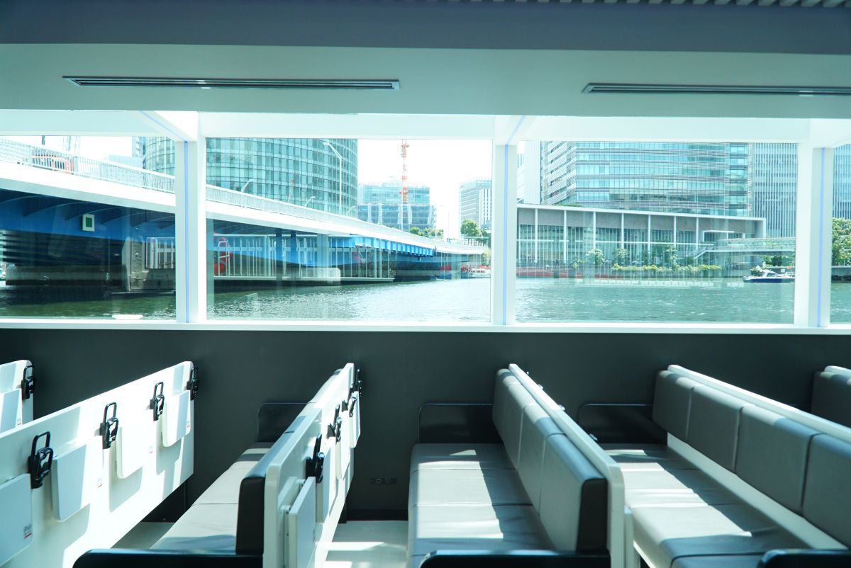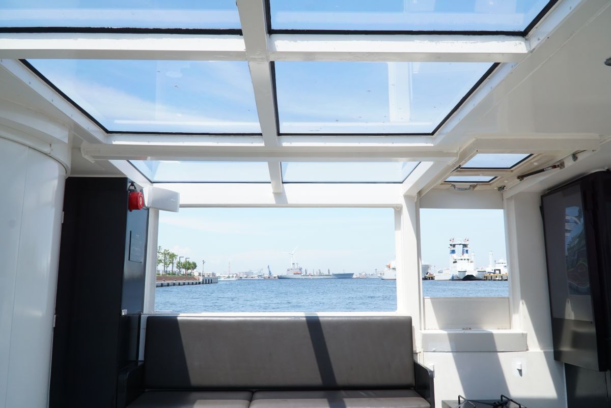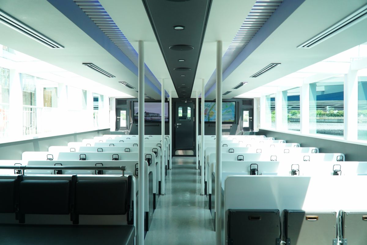 「シーバスZERO」の船内客室部の座席は広々として快適。両サイドの窓は天井部分まであるため、開放的な印象です。定員は最大で130名まで乗船可能。