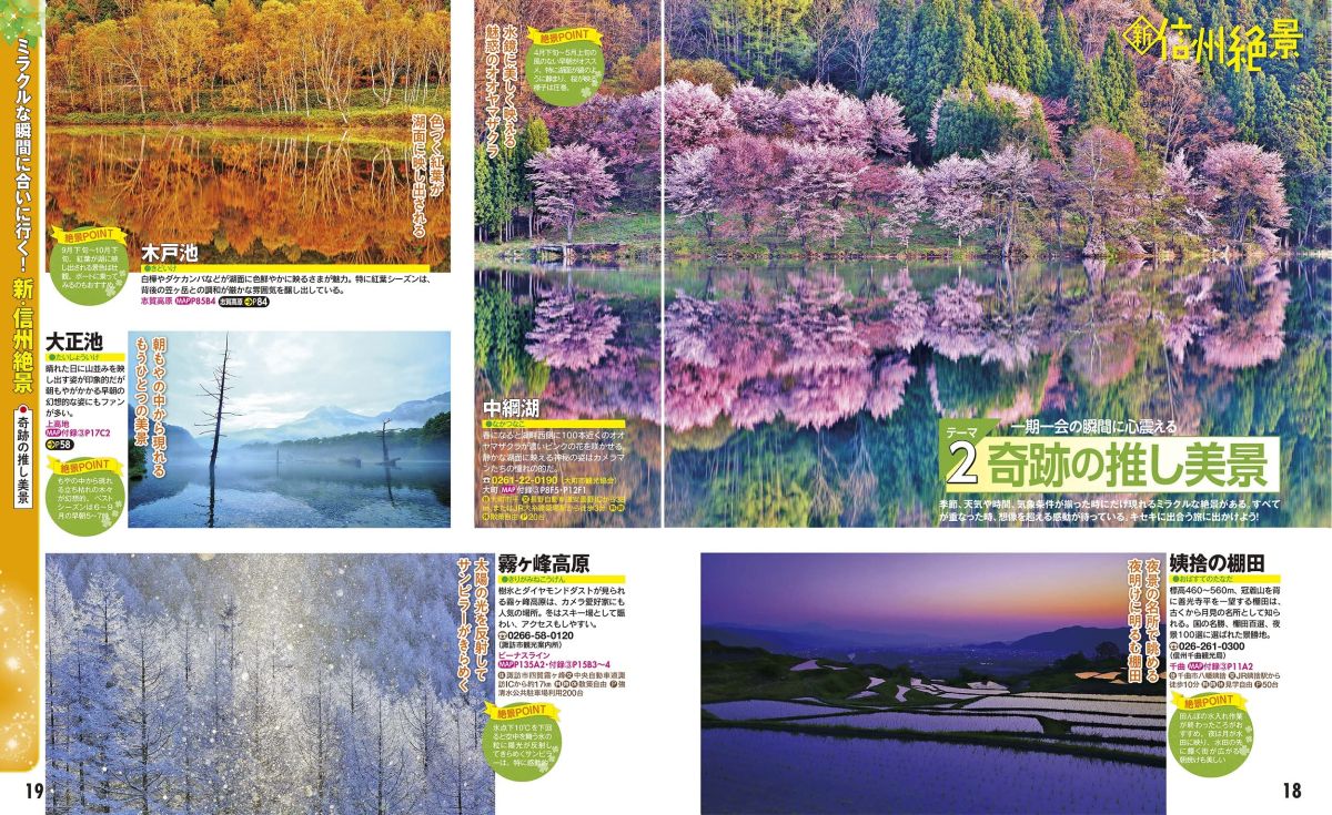 本誌でも、美しい北アルプスの山並みを眺めながら過ごせるテラスや、湖に反射する艶やかな桜、夜明けの棚田など、一度は見てみたい奇跡の絶景をご紹介。信州グルメの王道・そばやご当地グルメ、フルーツたっぷりのスイーツなど、グルメ情報も充実!