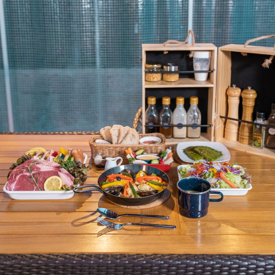 夕食は豪華なBBQ!厳選牛のステーキをはじめとした豪華なお肉や、地元野菜のフレッシュサラダ、抹茶のパンケーキなど贅沢なラインナップです。
