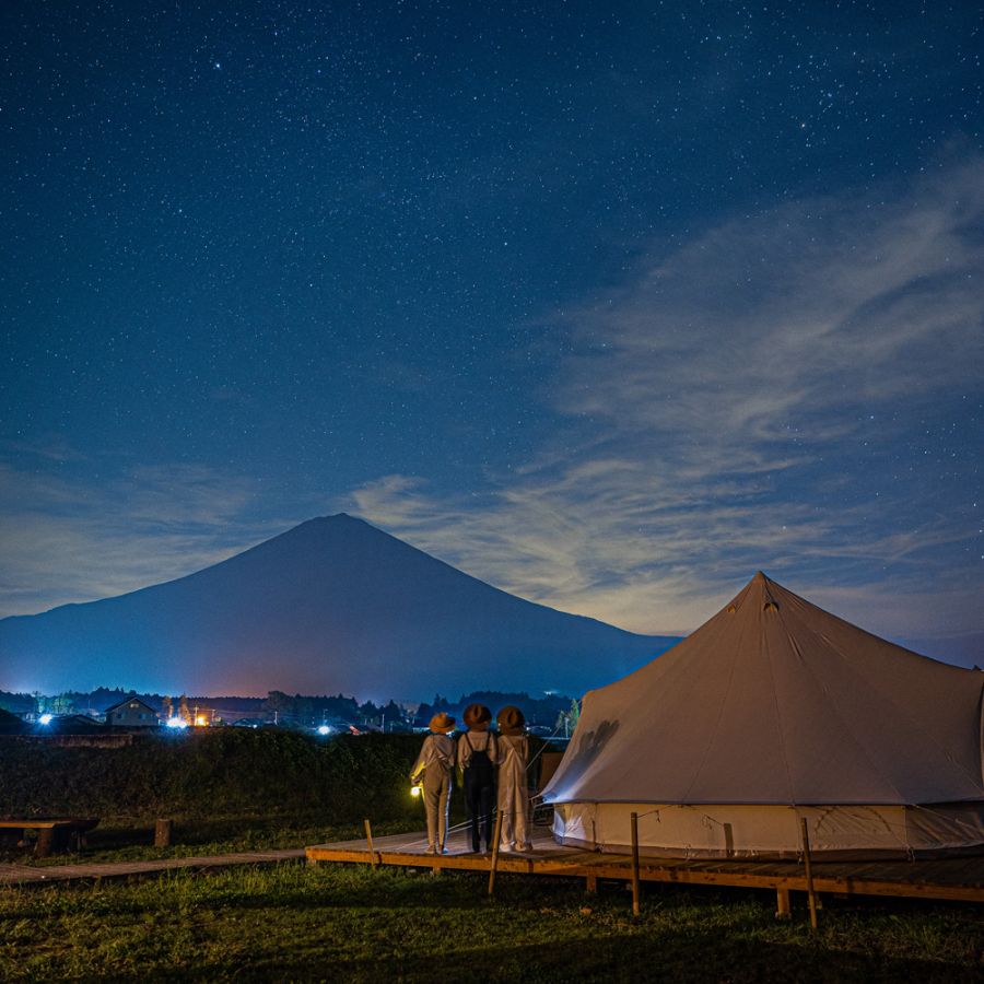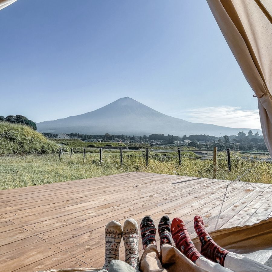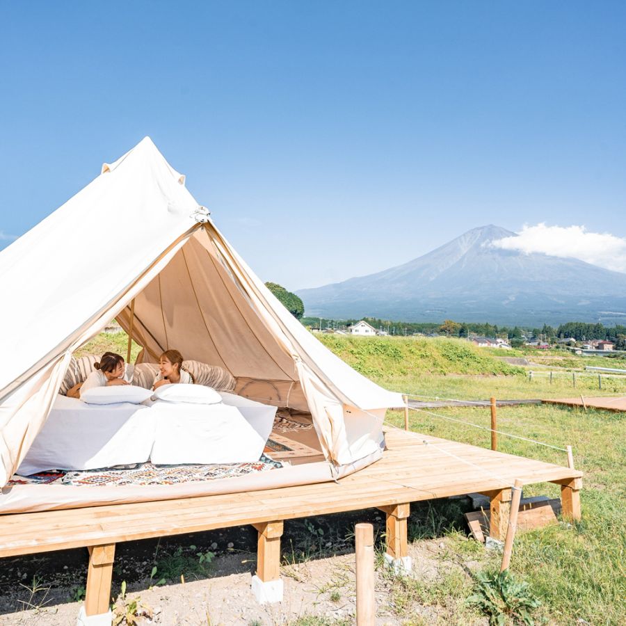 宿泊するテントは誰もが一度は憧れるような三角のベルテント。テントからは大きな富士山を独り占めできます!