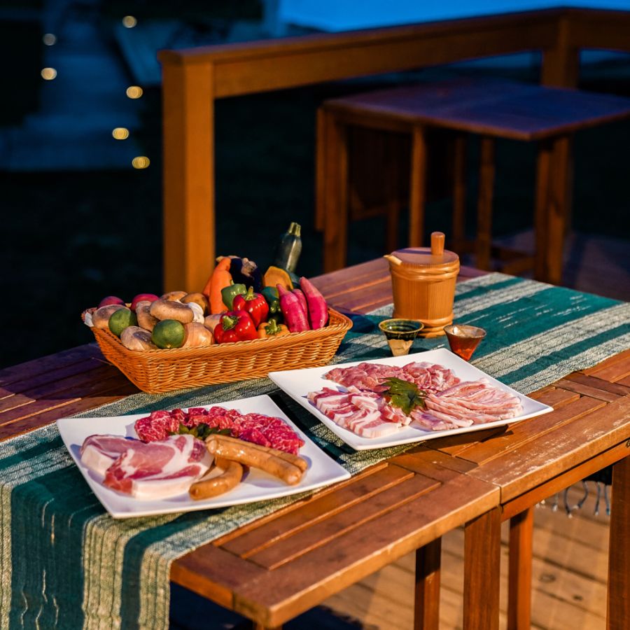 夕食は大自然の中、BBQが食べられます。食材はすべて富士宮産。「みずみずしい野菜と新鮮なお肉は絶品!」とYurisuさんお墨付きです。