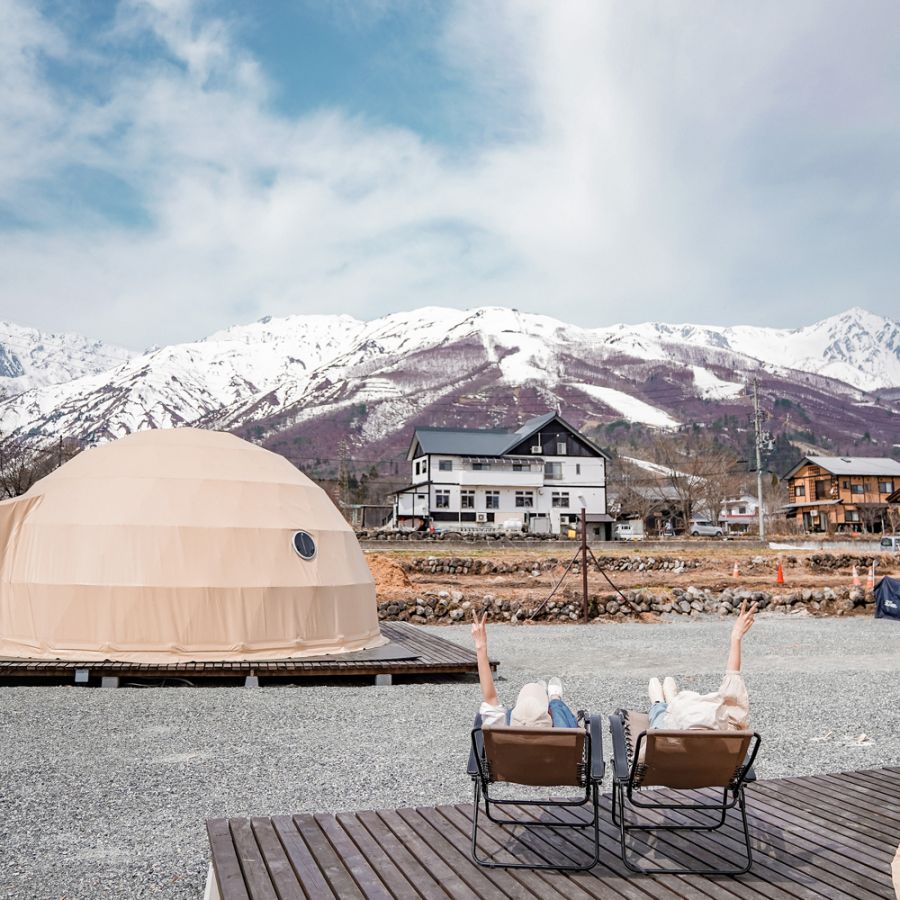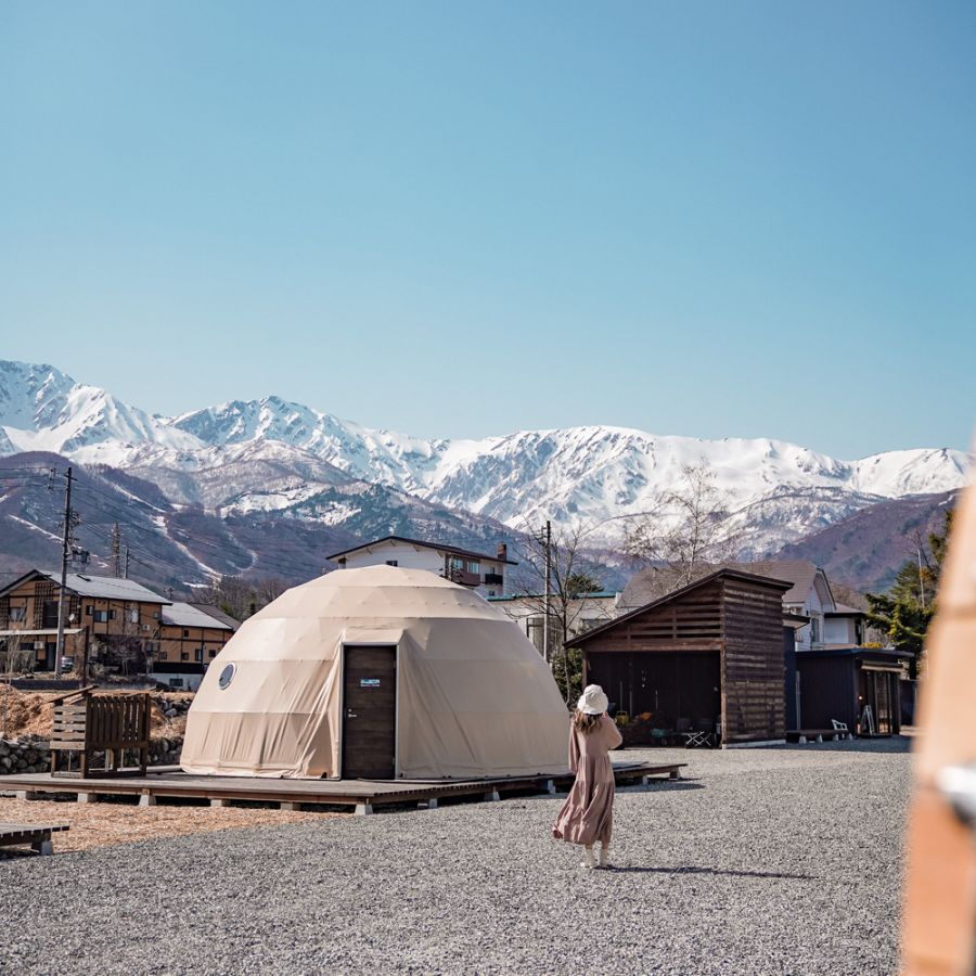 施設内には白馬岳を背景に、ドーム型のテントが並びます。自然とのコントラストも抜群です!