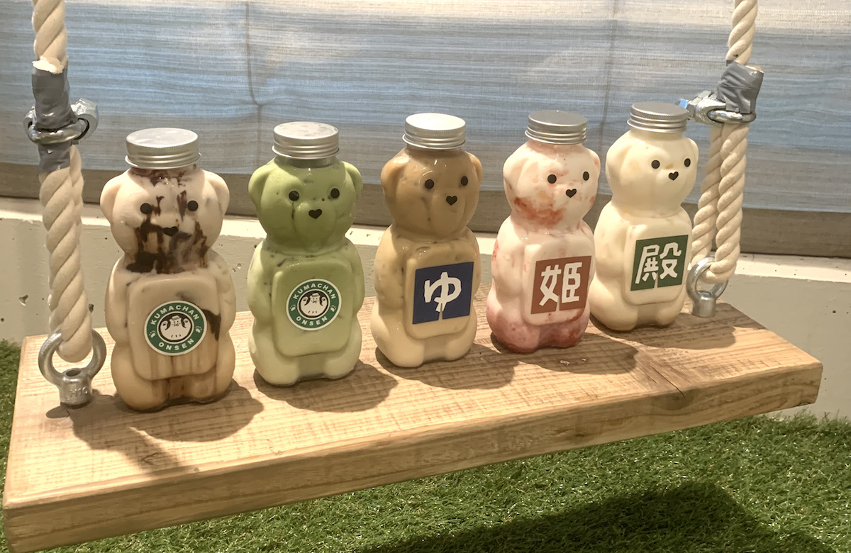 くまちゃんのかわいいボトルに入った「湯上りミルクドリンク」各690円。「北海道コーヒー牛乳」、「いちごミルク」、「ぷりんミルク」、「抹茶ミルク」、「チョコミルク」の5種類はどれもおすすめ!お友達と一緒に購入して並べるのもキュートですよ♪