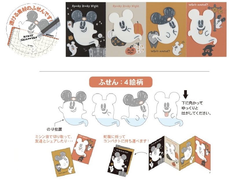 透ける4つのゴースト型ふせん。台紙を切り分けてお友だちとシェアしたり、折りたたんで持ち運びもOK。