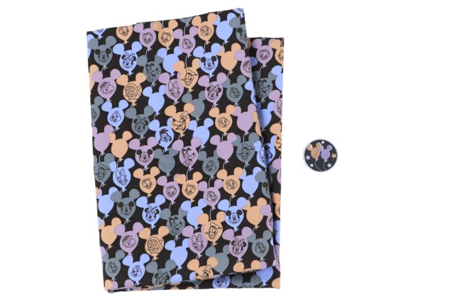 ハロウィーンカラーのバルーンにキャラクターが描かれたデザインのカットクロス。サイズは縦約100×横約100cm。4㎝のワッペン付き。
