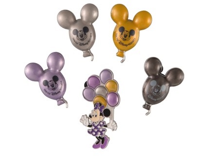 ぷっくりとした形のハロウィーンカラーバルーンとバルーンを持つミニーのピンバッチのセット。