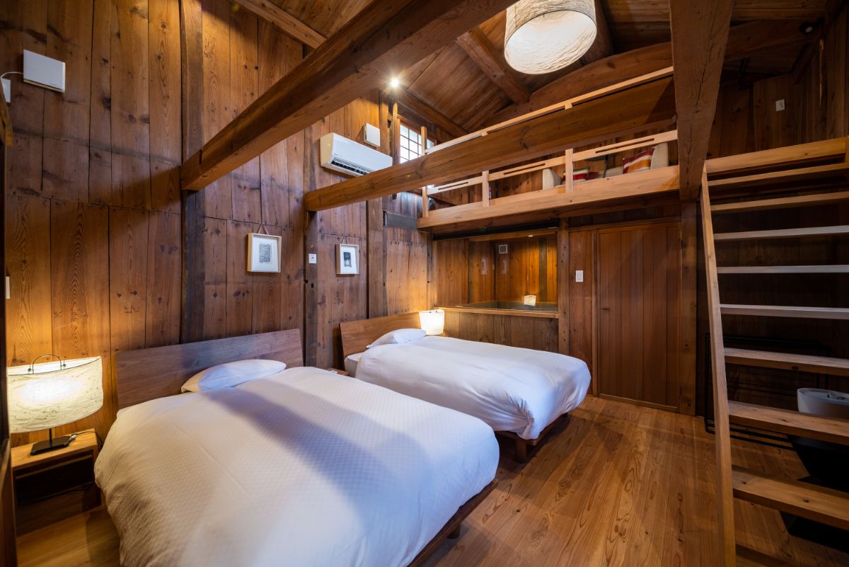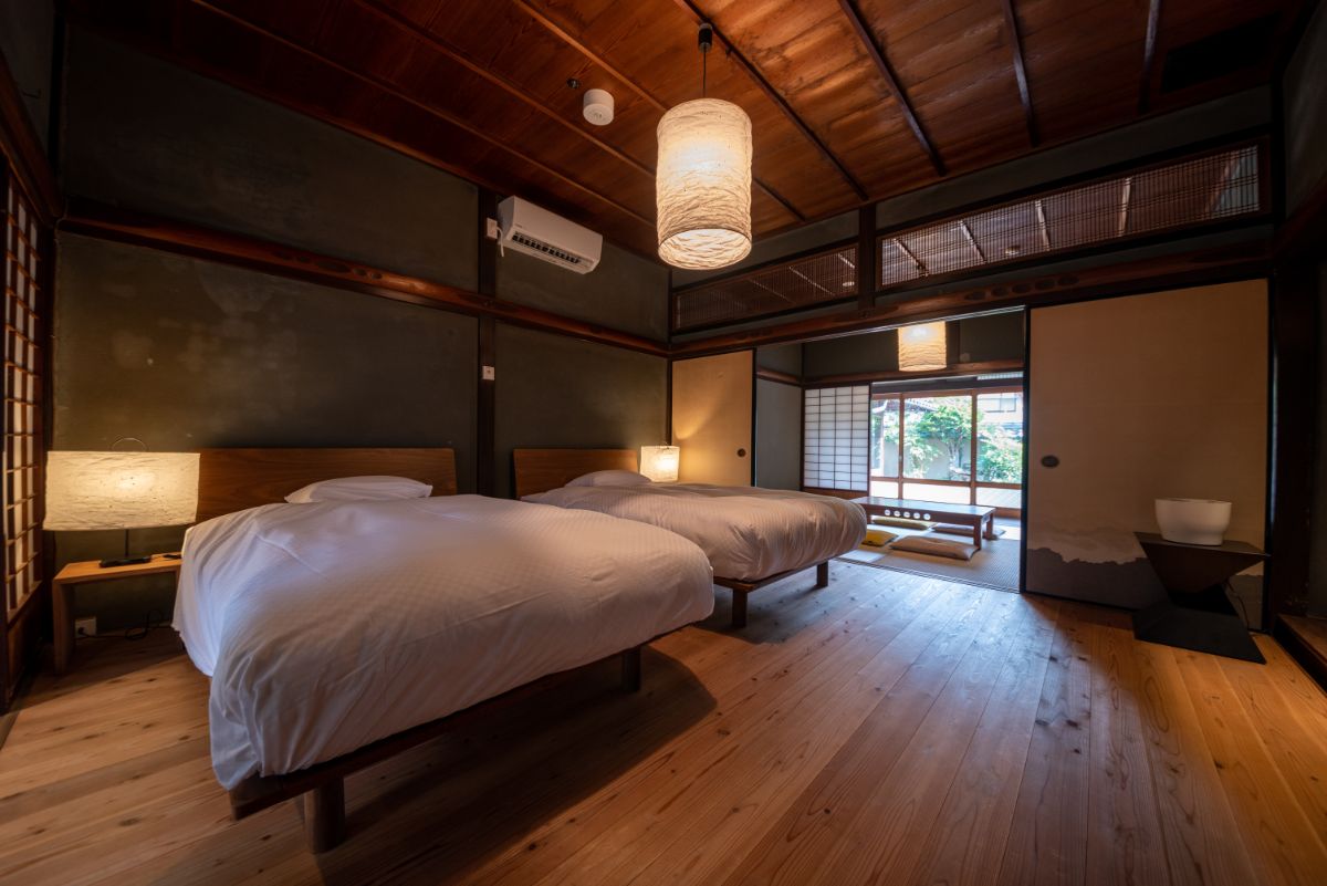 102号室は、かつて味噌蔵だった2つの建物をリノベーションした客室。天井が高く開放的な空間で、梁や建具、ガラス窓のひとつひとつに、職人の意匠と日本建築の美が息づいています。スペースも広々としていて、布団もしくはエキストラベッドを用意すれば、最大3名まで利用可能。添い寝ができるお子様連れにもおすすめです。
