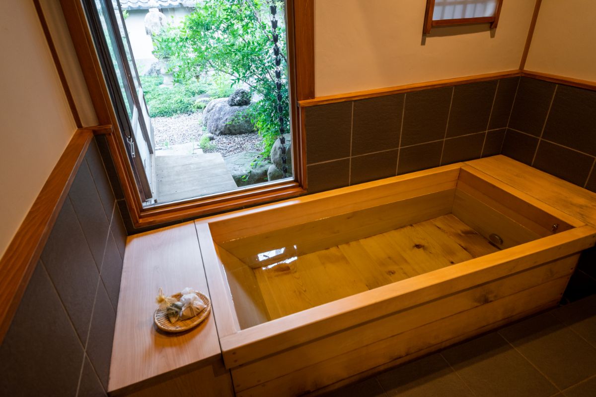 どの客室にも木の優しい香りに包まれる檜風呂が備わっています。湯船も広く、足を伸ばしてリラックスできるのもうれしいポイント。こちらは101号室の浴室。職人の見事な技が光る格子窓が配され、まるで江戸時代の殿様になったような気分に。窓の外には美しい庭が広がり、季節の移ろいを感じながら開放的な気分でバスタイムを楽しめます。