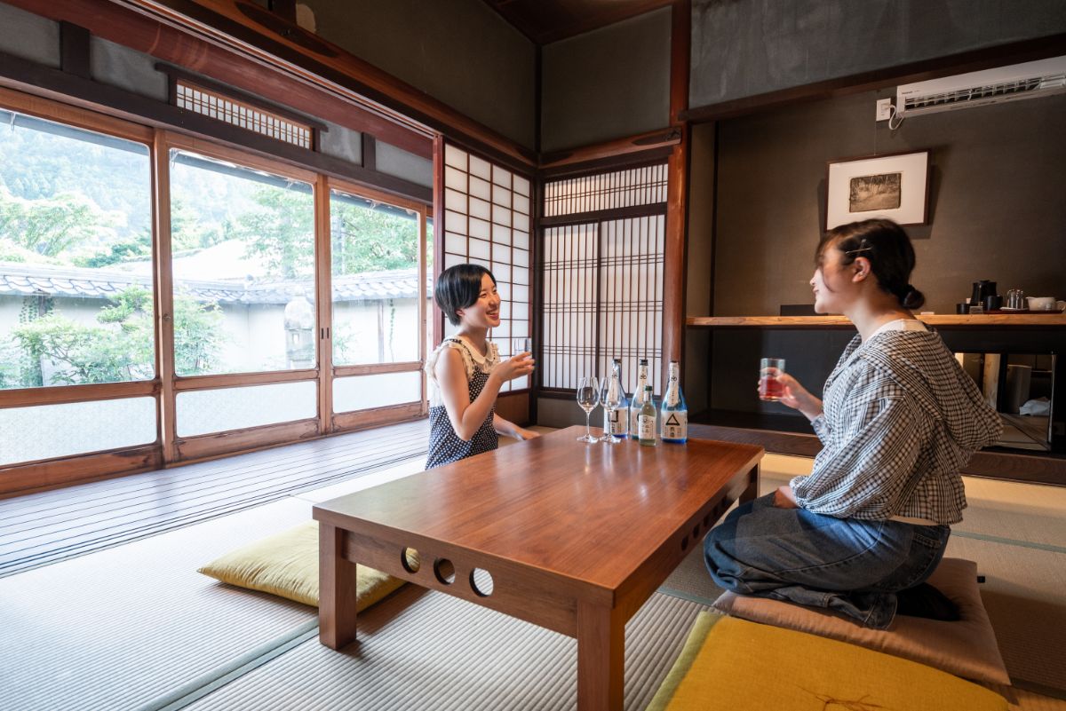 客室でのおこもり時間を充実させてくれるのが、ドリンクのサービス。丹波地域の日本酒を筆頭に、アルコールをはじめいろいろなドリンクがフリーラウンジに用意されています。客室でゆっくりと味わえば身も心も開放的になって、会話もさらに弾みます。