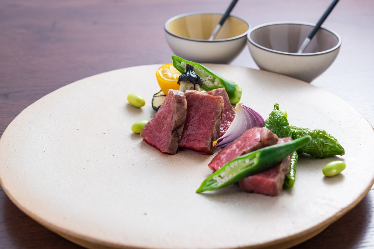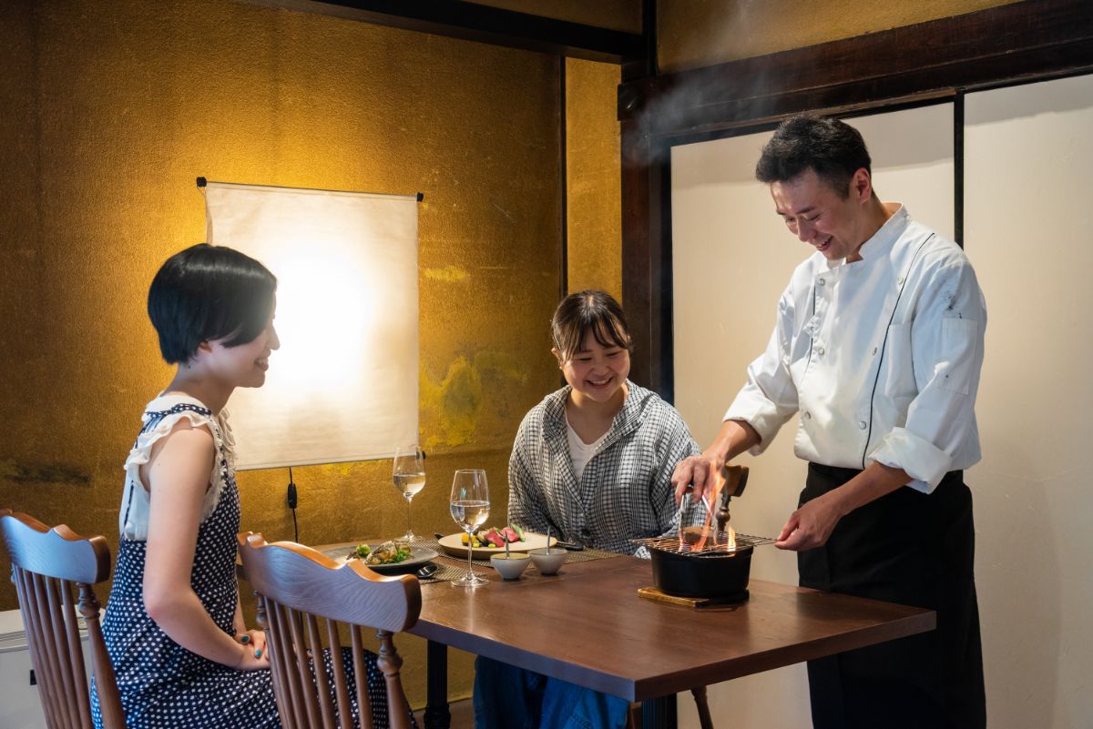 ときには、シェフが目の前で料理を仕上げてくれることも。この日は、厳選した黒毛和牛をカツオのタタキのように藁焼きにして提供。立ちこめる香りに、味への期待も一層高まります。料理との相性も考えてセレクトされた丹波の日本酒とともに、美食と美酒のマリアージュを楽しみましょう。
