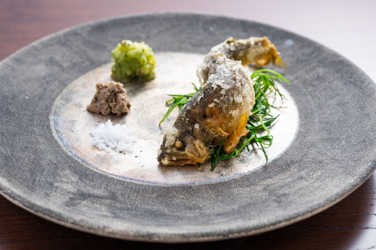 フレンチ出身の樫田シェフが手がける料理は、和食をベースにフレンチの技法やアイデアが随所にちりばめられています。その独創的なメニューは目にも麗しい一品揃い。こちらは油に食材を浸してじっくりと煮るコンフィの技法を用いた「鮎 姿揚げ」。身はもちろん骨まで食べられるよう、丸一日火入れを行うというから驚きです。丹波焼の窯元が手がけた器が、料理の美しさをさらに引き立ててくれます。