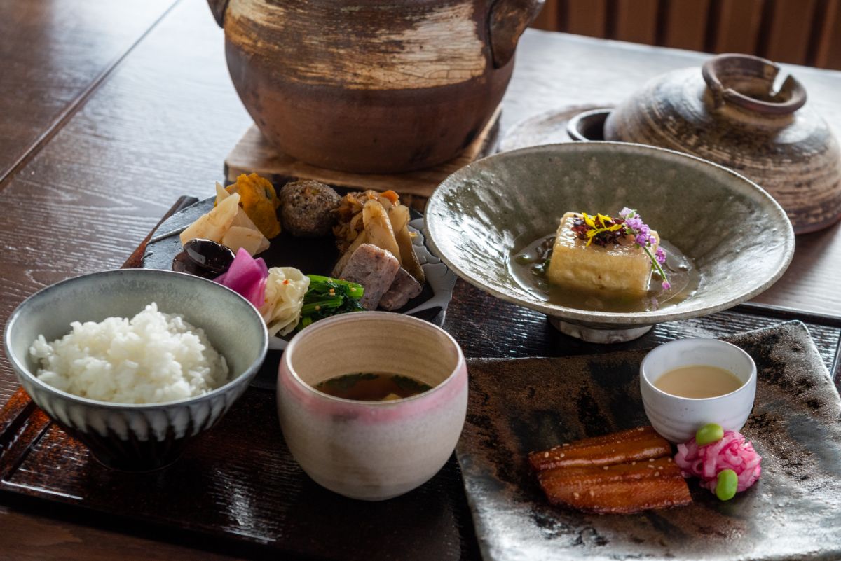こちらは樫田シェフが「おばあちゃんが帰ってきた孫に料理をふるまう」ことをイメージして献立を考えたという朝ごはん。丹波篠山市内で収穫されたコシヒカリ「デカンショ米」を土鍋でふっくら炊き上げ、地元でとれた野菜を中心に栄養バランスの取れたおかずを多品種用意。朝からしっかり食べて、アクティブな旅をスタート。
