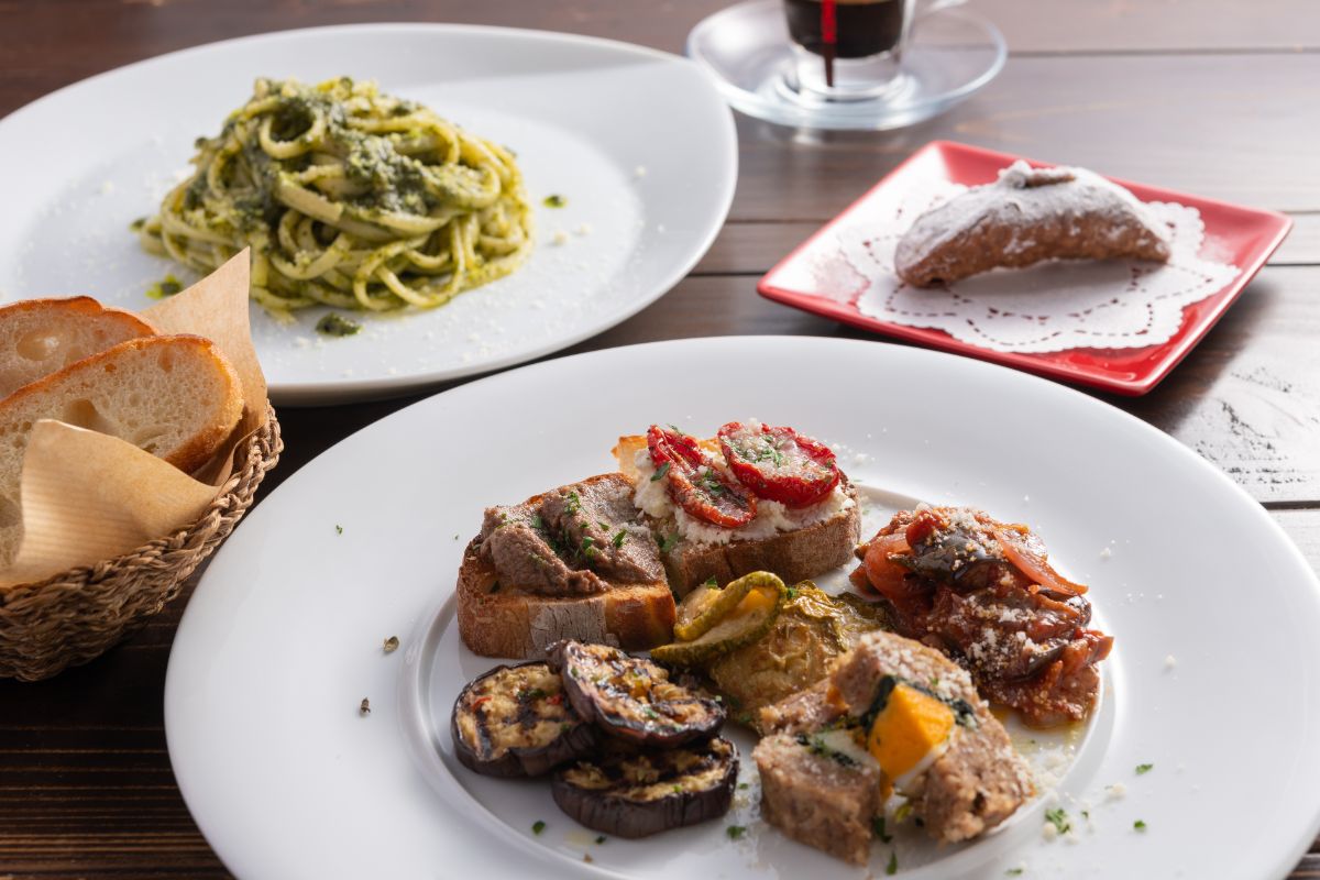 前菜の盛り合わせの「アンティ パスト・ミスト」1650円は、ボリューム満点。パスタも有機バジルを使用した「自家製ペストのジェノベーゼ」1350円をはじめ、8種類前後の豊富なメニューから選べます。食後やカフェタイムには、奥さんのこだわりが詰まったドルチェもぜひ。落ち着きのある空間で料理やワイン、カフェやドルチェを静かな町並みとともに楽しめます。ランチは予約優先なので、事前に問合せをしてから向かいましょう。