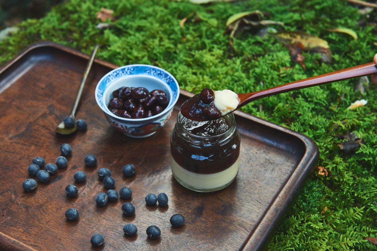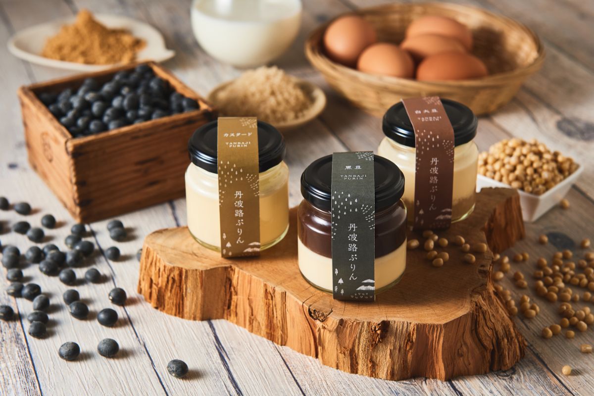 全国放送のTV番組で紹介されたことをきっかけに話題となった看板商品「黒豆ぷりん」450円。丹波篠山産の黒豆をじっくりと糖度を上げながらぷっくりと煮上げ、豊かな味わいのゼリーで包み込み、プリンとの2層に仕上げます。完成までには4日かかるそうで、ミルキーなプリンと存在感のある大粒の丹波黒豆をのせたゼリーのハーモニーが絶妙です。