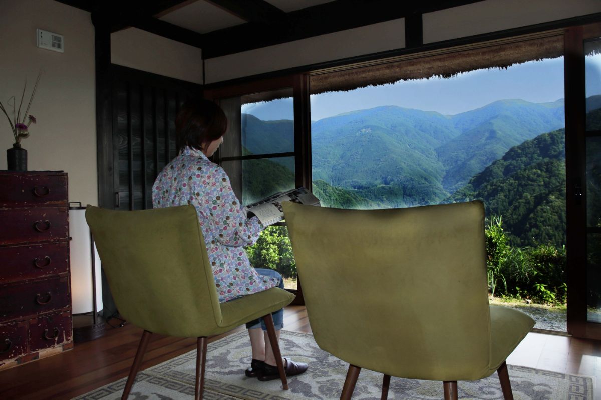 目の前に祖谷の山々のパノラマが広がる「天一方」の中の間。祖谷の夏は、冷涼で爽やか。窓を開けて椅子に座れば気持ちよい自然の風を感じられます。秋は美しい祖谷の紅葉をこの特等席で。部屋の内部はリノベーションされ、エアコン・暖房も完備されているため、一年を通して快適に過ごせます。