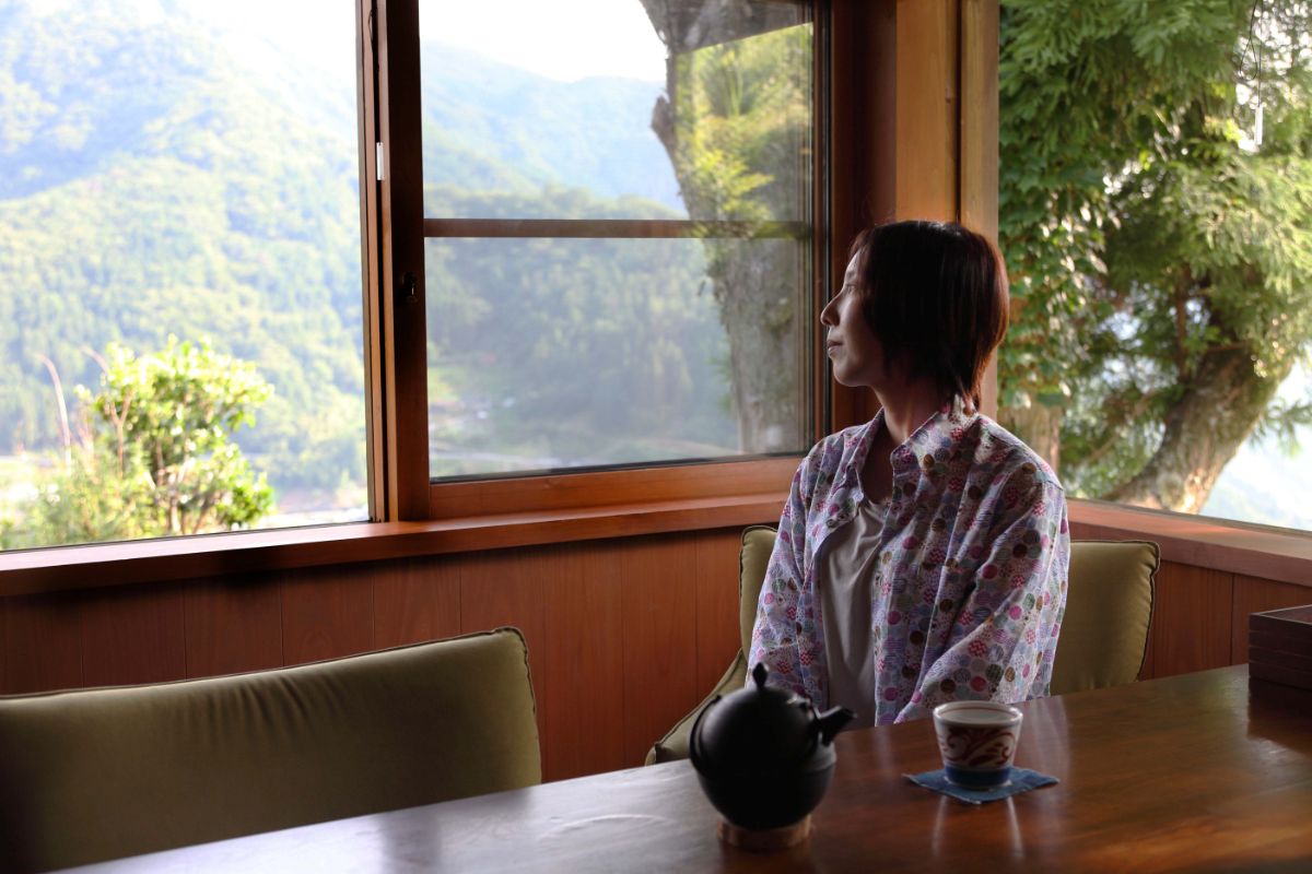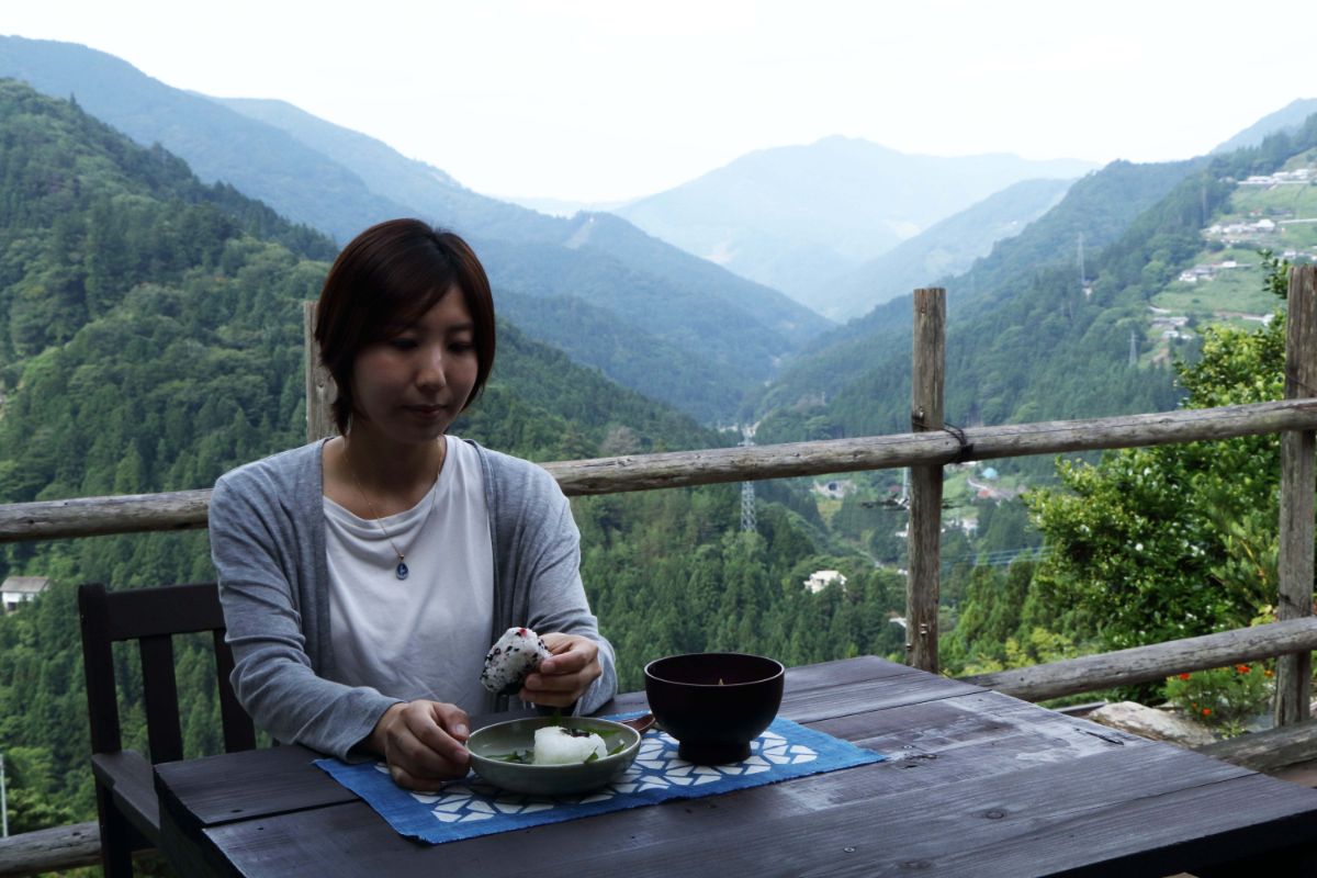 こちらは、集落の中腹に位置する「蒼天(そうてん)」のテラス。目の前に迫る山々の景色を眺めながら、お茶を飲んだり、朝ごはんを食べたり、おいしい空気の中、リラックスして過ごせます。朝食は付かないので、事前に購入しておきましょう。